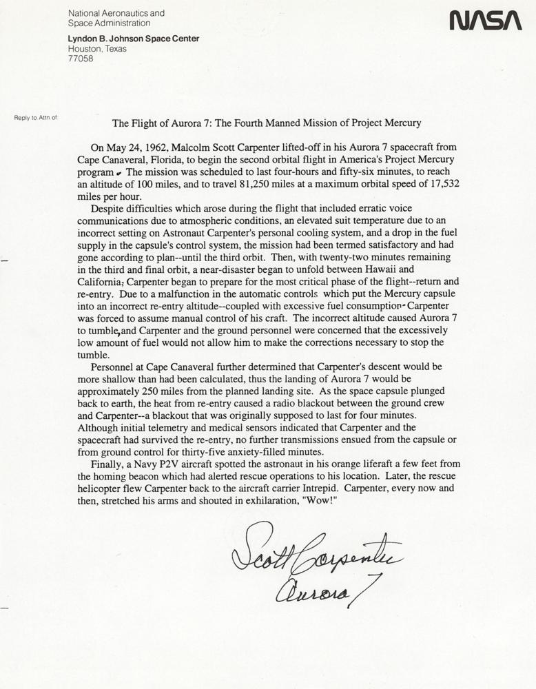 Souvenir typescript, one page, 8.5 x 11, NASA letterhead, signed at the conclusion in black felt tip, "Scott Carpenter, Aurora 7." Headed "The Flight of Aurora 7, The Fourth Manned Mission of Project Mercury," the piece provides a summary of Carpenter's historic flight. In fine condition, with a crease to the lower right corner.