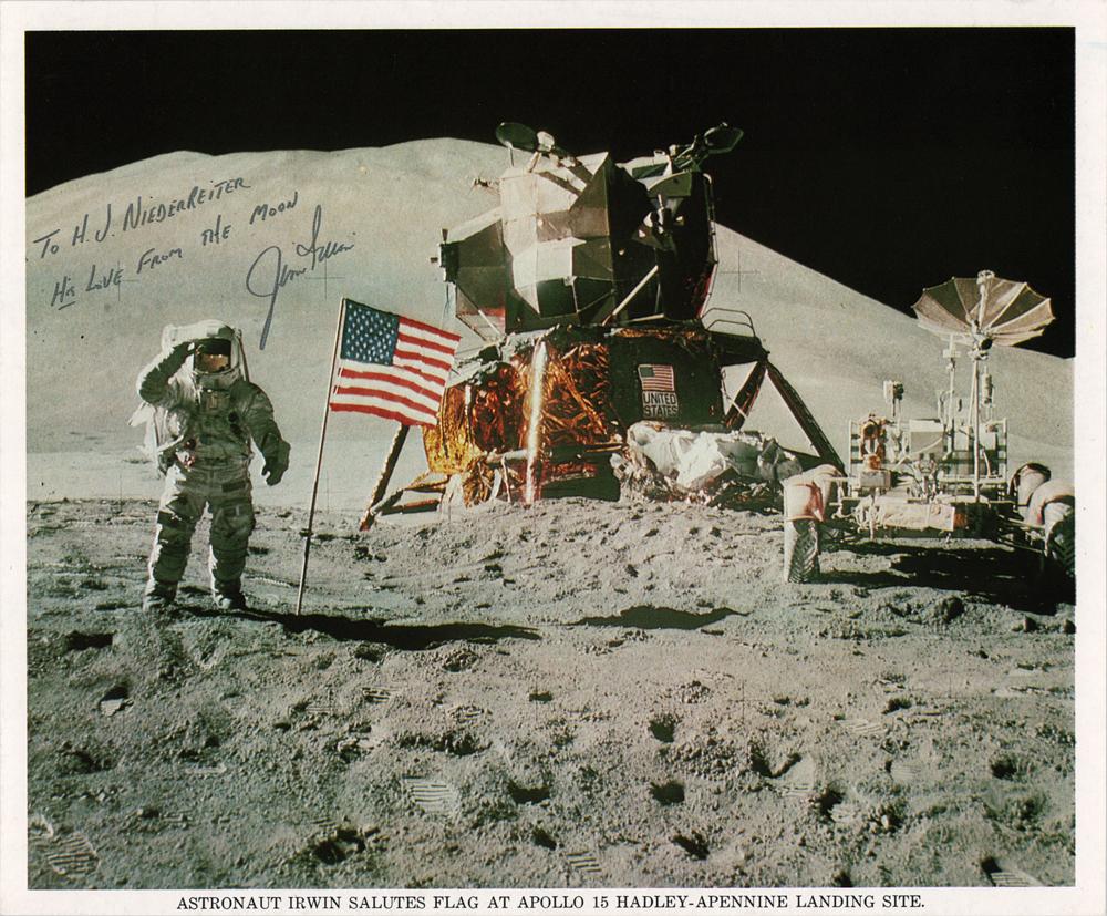 Official color 10 x 8 NASA lithograph of Jim Irwin saluting the American flag at the Apollo 15 landing site, signed and inscribed in black felt tip, "To H. J. Niedereiter, His Love From The Moon, Jim Irwin.” In very fine condition.