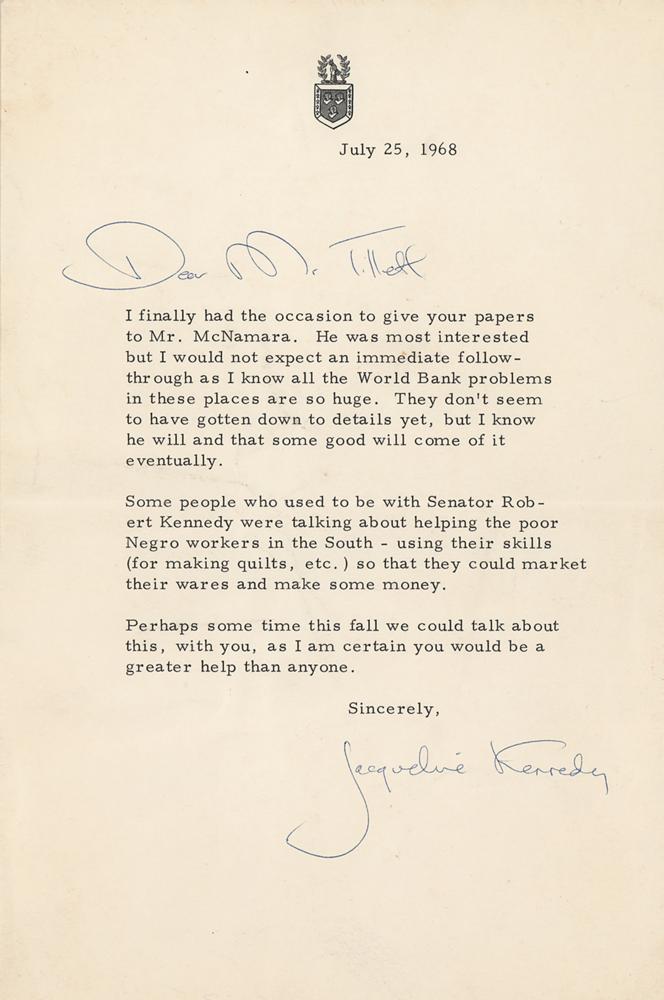 TLS, one page, 6.25 x 9.25, John F. Kennedy Coat of Arms letterhead, July 25, 1968. Letter to artist and needlepoint designer Leslie Tillett, in full: “I finally had the occasion to give your papers to Mr. McNamara. He was most interested but I would not expect an immediate follow-through as I know all the World Bank problems in these places are so huge. They don’t seem to have gotten down to details yet, but I know he will and that some good will come of it eventually. Some people who used to be with Senator Robert Kennedy were talking about helping the poor Negro workers in the South—using their skills (for making quilts, etc.) so that they could market their wares and make some money. Perhaps some time this fall we could talk about this, with you, as I am certain you would be a greater help than anyone.” Jackie adds the salutation in her own hand. In fine condition, with some light creasing.