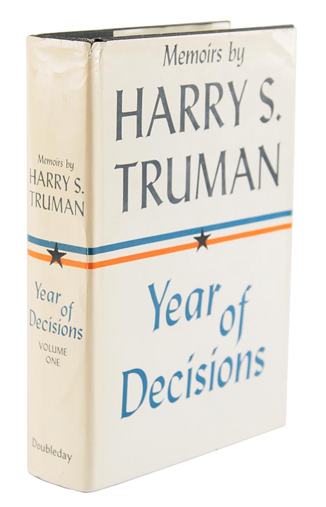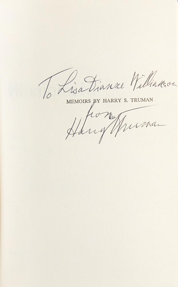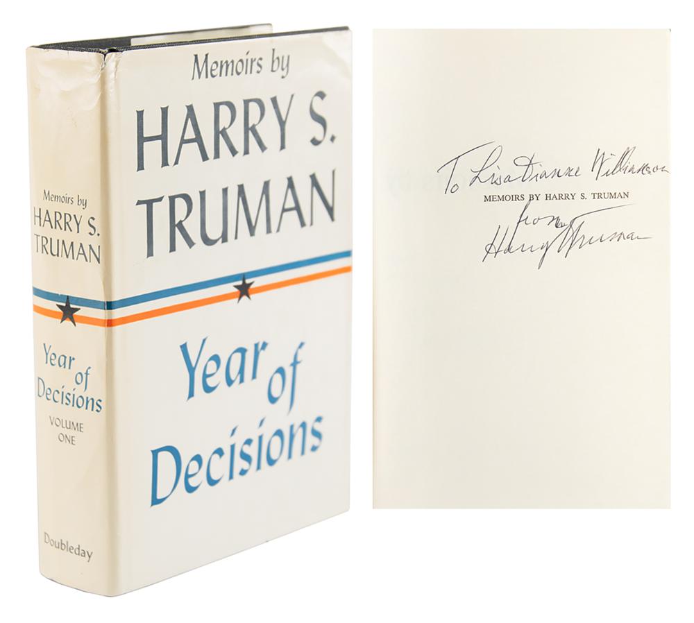 Signed book: Memoirs by Harry S. Truman: Year of Decisions. First edition. NY: Doubleday & Company, 1955. Hardcover with dust jacket, 6 x 8.5, 596 pages. Signed and inscribed on the half-title page in black ink, "To Lisa Dianne Williamson, from, Harry S. Truman." In fine condition, with light toning and wear to the dust jacket.