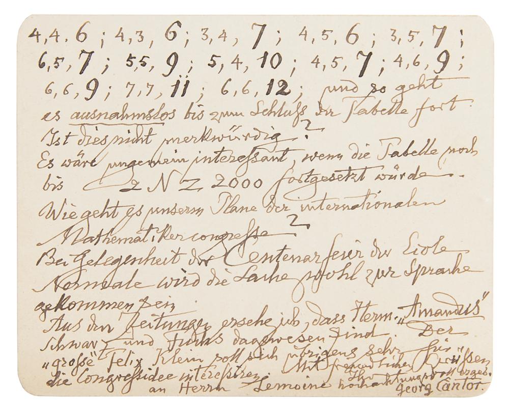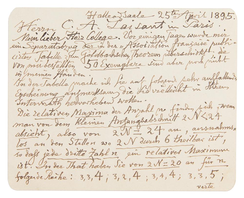In part: "My dear colleague, a few days ago I was sent a separate offprint of the Table for the Goldbach Theorem published in the ‘French Association.’ However, I have not yet received the 50 copies which I have ordered. I draw your attention to the very striking phenomenon that you may wish to highlight in your magazine." Cantor goes on describing technical details about relative maxima in the number of decompositions of integers as a sum of prime numbers, quoting his data to make his point. He then continues: "And so it goes on without exception until the end of the table. Is it not strange? It would be extremely interesting if the table continued until 2N=2000. How are going our plans regarding the International Congress of Mathematicians? The matter has probably been discussed at the occasion of the centenary celebrations of the École Normale. From the newspaper, I see that Messrs ‘Amandus,’ Schwarz and Fuchs have been there. Incidentally, ‘the great’ Felix Klein is said to be very interested in the idea of the congress." In fine condition.
