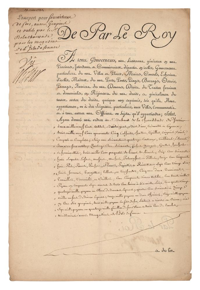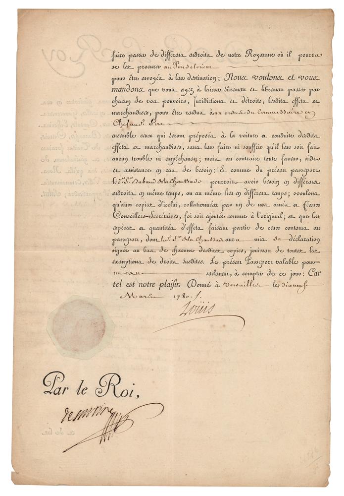 Scarce DS in French, signed “Necker” and "de Sartine," one page both sides, 9.5 x 14.5, March 19, 1780. Beautiful and large official document, signed at the head by Necker (with an autograph word, “vu”, meaning “seen”), and also signed at the conclusion by Secretary of State for the Navy Antoine de Sartine. The document also bears a secretarial signature of King Louis XVI. In fine condition.