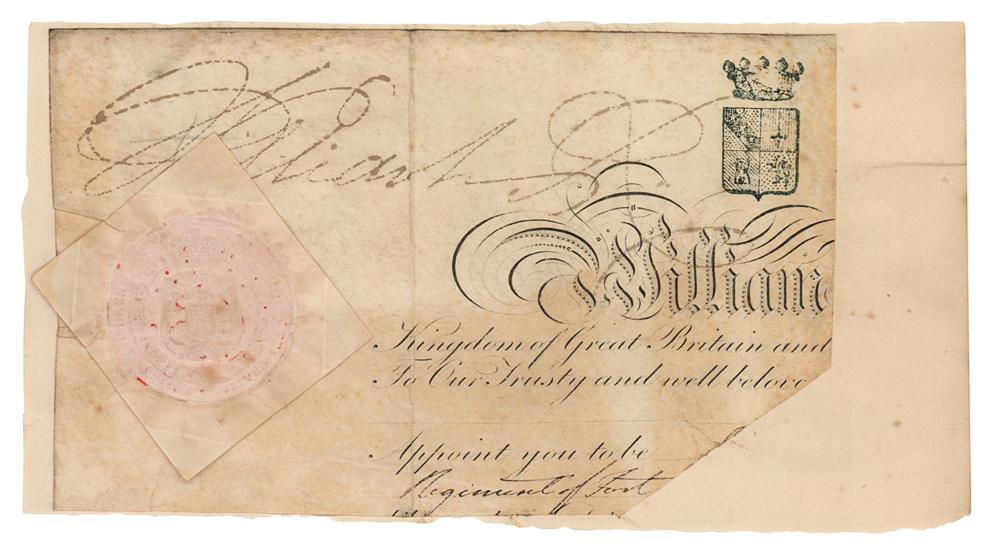 King of Great Britain and Ireland (1765-1837) from 1830 to 1837, he earned the sobriquet 'Sailor King' for his youthful service in the Royal Navy. Large ink signature, "William R,” on an off-white 7.25 x 4.5 slip clipped from the head of a document. The white paper seal affixed to the left side remains intact. Affixed to a slightly larger sheet and in very good to fine condition, with light toning and soiling.