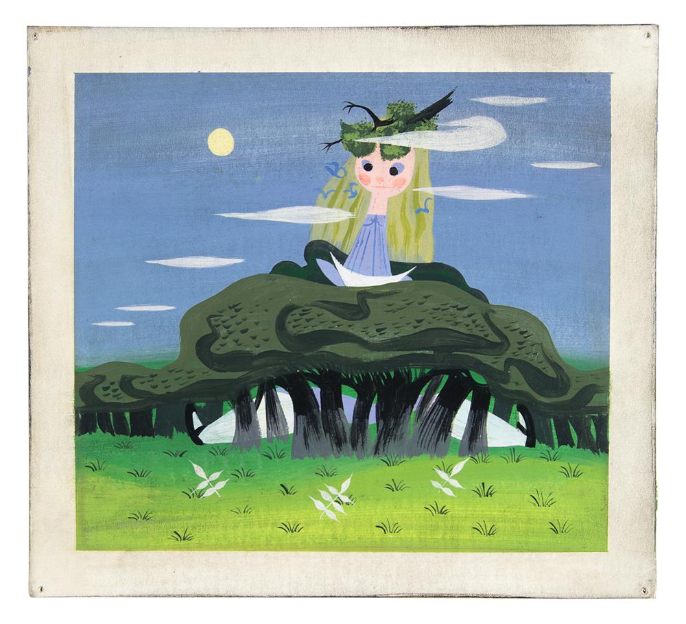 (Walt Disney Studios, 1951) Stupendous original concept painting by Mary Blair for Alice in Wonderland, which depicts Alice at her very biggest, her head sticking out from the canopy of the Wonderland forest. After taking the Caterpillar’s advice, Alice tasted a mushroom that greatly increased her size and sent her growing body crashing up through the tree limbs. Blair renders the scene with great comedic effect and detail, showing Alice as a giant, her head surrounded by clouds and birds and topped with a broken tree as her long legs stick sideways through the grove. Accomplished in tempera on 10 x 9.25 artist's board. In fine condition, with tack holes at corners. Blair was a concept artist for Disney during the 1940s and early 1950s, working on designs for such films as Peter Pan, Cinderella, and Alice in Wonderland. She also created designs for several Disney attractions (including It's a Small World), and her largest work ever, the multi-story mosaic in Disney World's Contemporary Hotel concourse.