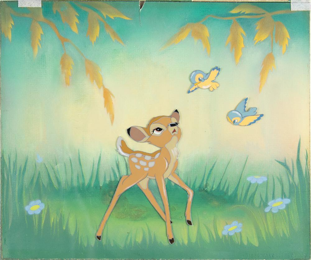 (Walt Disney Studios, 1942) Marvelous original production cel and hand-painted background of Bambi and two bluebirds from Bambi, showing the young deer in an inquisitive full-length pose as he peers up at a pair of fluttering forest birds. The cel has been trimmed and applied to a gorgeous hand-painted background as prepared by Courvoisier Galleries for sale. Character images measure 3 x 4 (Bambi) and 1 x 1 (each bird), with overall dimensions of 9.25 x 7.75. In fine condition. A fantastic Bambi set-up featuring clear, brilliant cels and an expertly realized Courvoisier background.