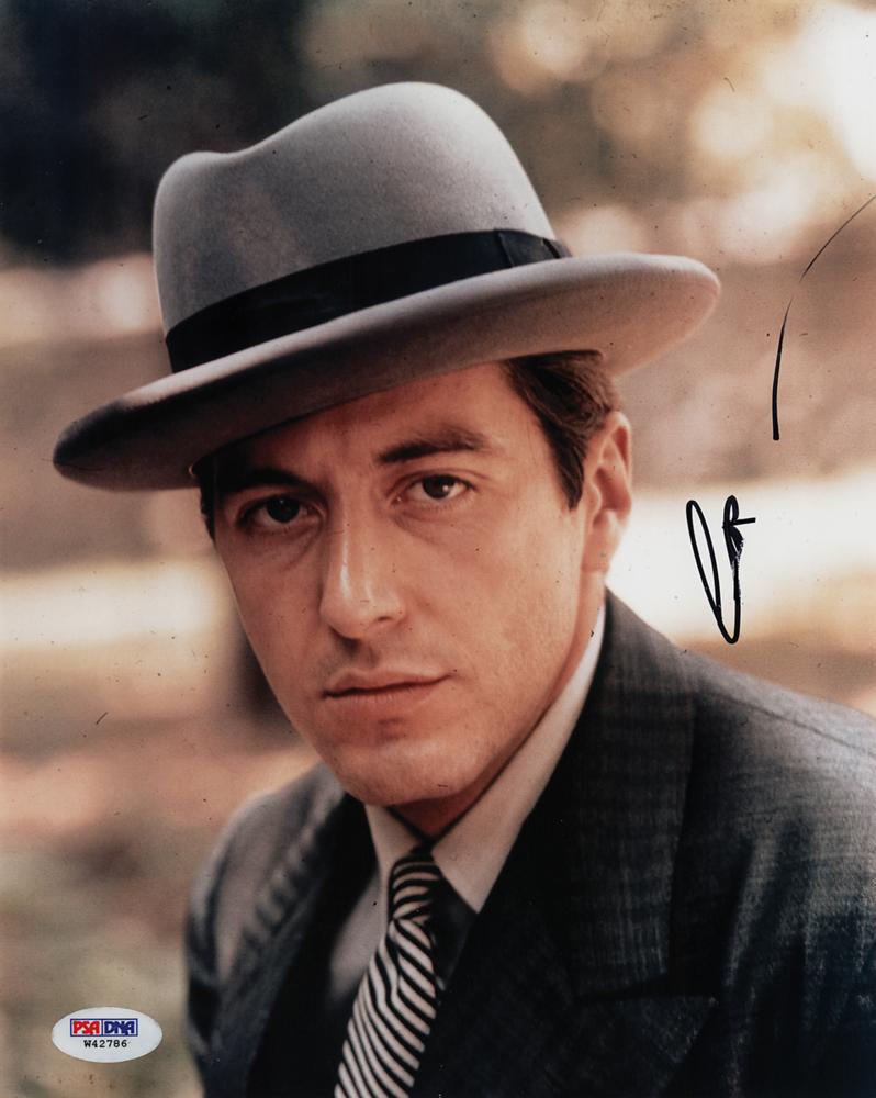 Color glossy 8 x 10 close-up photo of Al Pacino as Michael Corleone from The Godfather film trilogy, signed in black felt tip. In fine condition, with a PSA/DNA label affixed to the lower left corner (certificate not present).