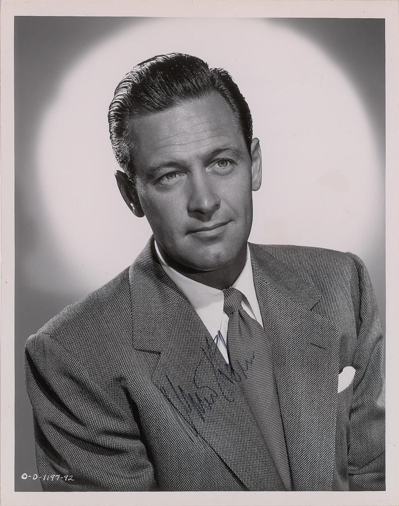 Glossy 8 x 10 photo of Holden in a handsome suit and tie, signed in black felt tip. Reverse bears a Columbia Pictures copyright stamp. In very good to fine condition, with creasing along the top border and to the upper left corner. Accompanied by a full letter of authenticity from PSA/DNA.