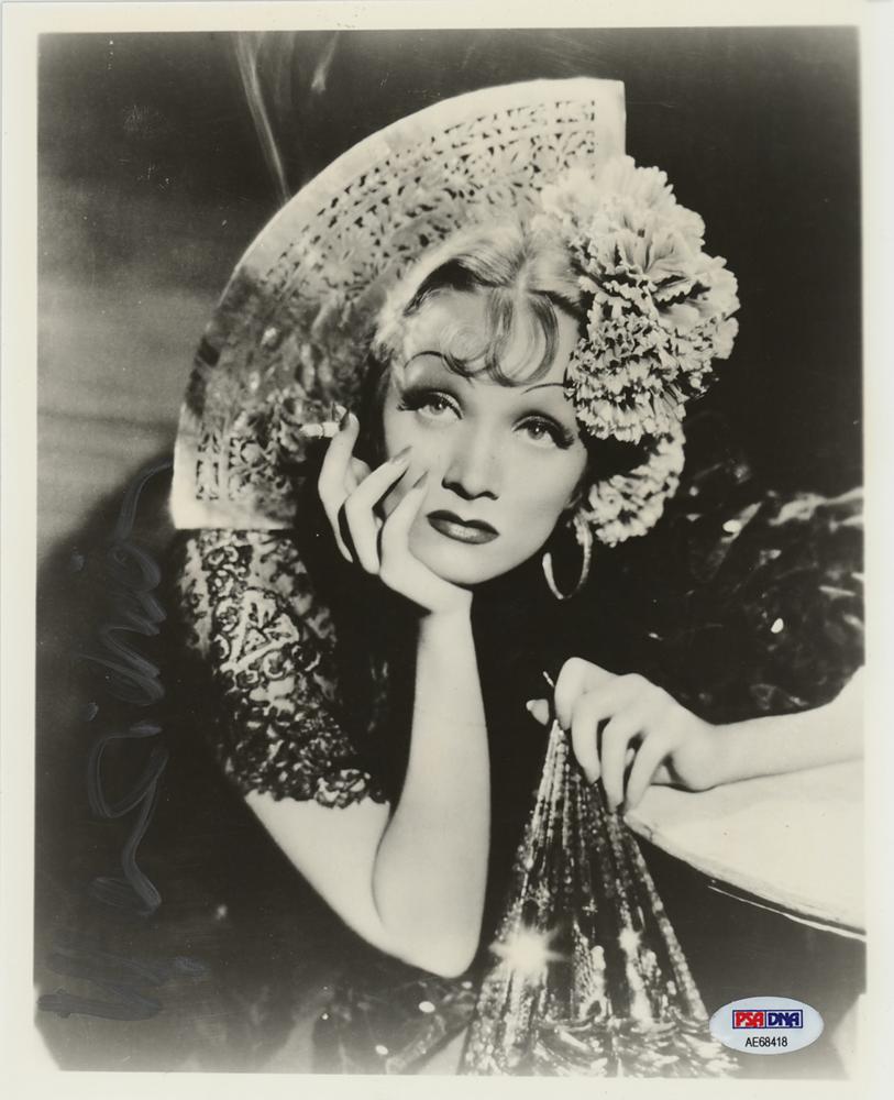 Glossy 8 x 10 photo of Marlene Dietrich dressed in an ornate costume and looking quite bored as she smokes a cigarette, signed vertically in silver ink. In fine condition, with a PSA/DNA label affixed to the lower right corner. Accompanied by a certificate of authenticity from PSA/DNA.