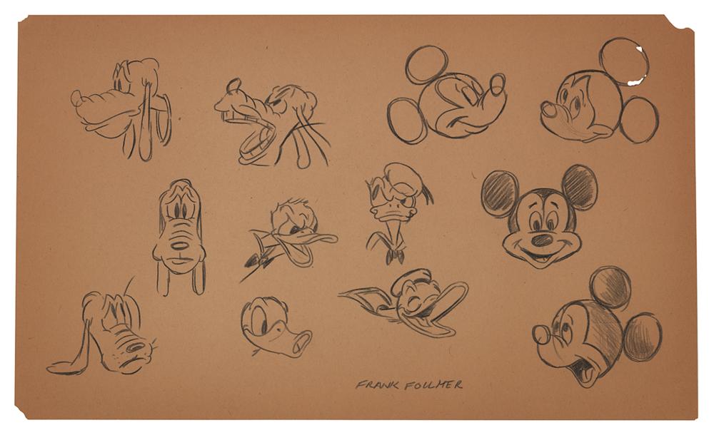 (Walt Disney Studios, 1940) Original model sheet drawing of Mickey Mouse, Donald Duck, and Pluto by Frank Follmer, which shows 12 different face images of the three popular characters with varying emotions and expressions. Accomplished in graphite on untrimmed 13.75 x 8.25 artist paper, which is signed in the lower right, "Frank Follmer.” In fine condition, with three missing corner tips and two small holes to the top ear of the upper-right Mickey. Accompanied by a copy of a letter from Walt Disney Archives regarding Follmer's participation with the company. Follmer worked at Walt Disney Studios from the late 1930s through the early 1940s, assisting on projects like Snow White and the Seven Dwarfs, Pinocchio, and Fantasia.