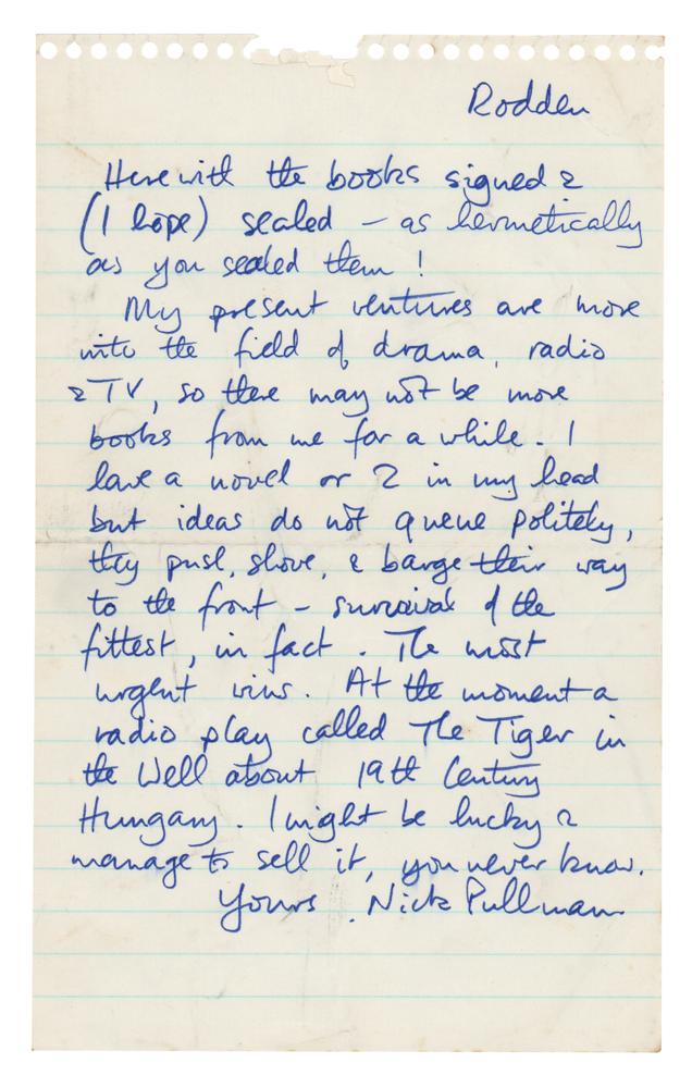 English writer (born 1946) best known for the fantasy trilogy His Dark Materials. ALS signed “Nick Pullman,” one page, 5 x 8, no date. Handwritten letter regarding his work, in part: "My present ventures are more into the field of drama, radio & TV, so there may not be more books from me for a while. I have a novel or 2 in my head but ideas do not queue politely, they push, shove, & barge their way to the front—survival of the fittest, in fact. The most urgent wins. At the moment a radio play called The Tiger in the Well about 19th century Hungary. I might be lick & manage to sell it, you never know." In fine condition.