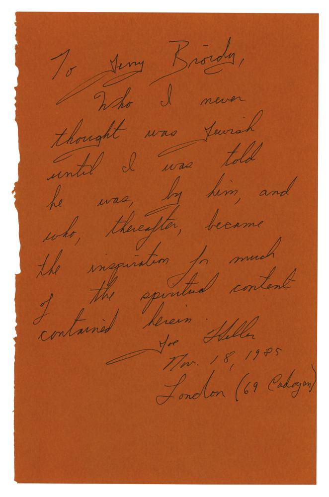 ANS, one page, 5.75 x 9.25, no date. Handwritten note on a flyleaf removed from a book, in full: "To Jerry Briody, Who I never thought was Jewish until I was told he was, by him, and who, thereafter, became the inspiration for much of the spiritual content contained therein. Joe Heller, Nov. 18, 1985, London (69 Cadogan)." In fine condition.