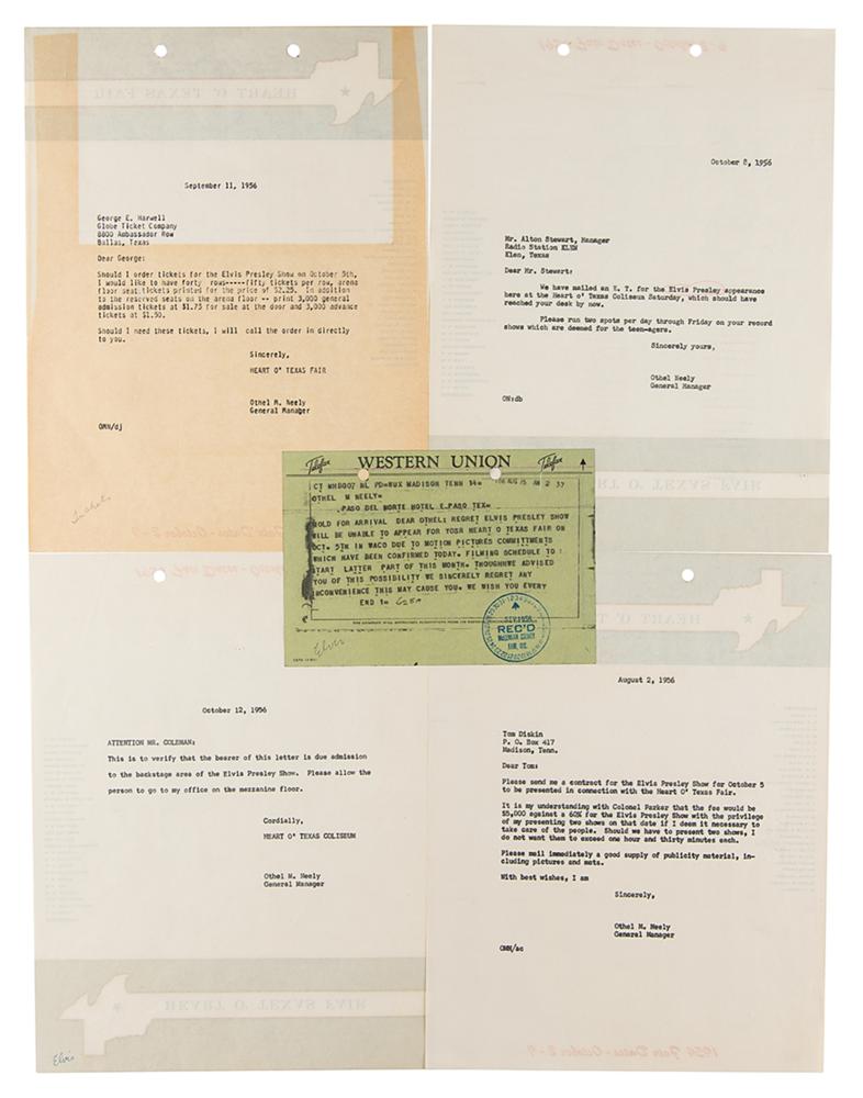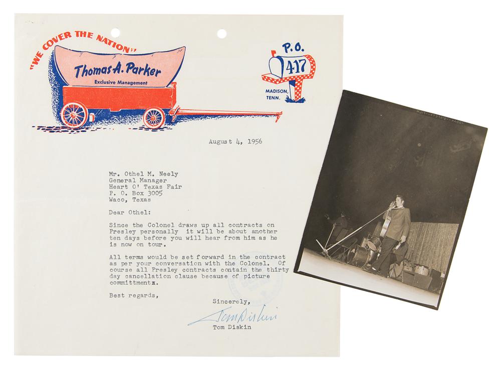 The collection contains five letters and one Western Union telegram between Elvis’s managers and Othel M. Neely, the general manager of the Heart O’ Texas Fair, which contains a TLS from Colonel Parker’s Assistant Tom Diskin, written August 4th on Parker’s illustrated ‘wagon’ letterhead, which reads: “Since the Colonel draws up all contracts on Presley personally it will be about another ten days before you will hear from him as he is now on tour.”