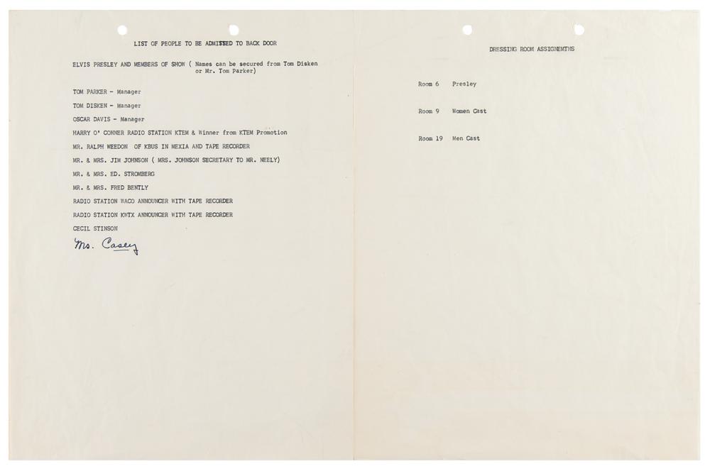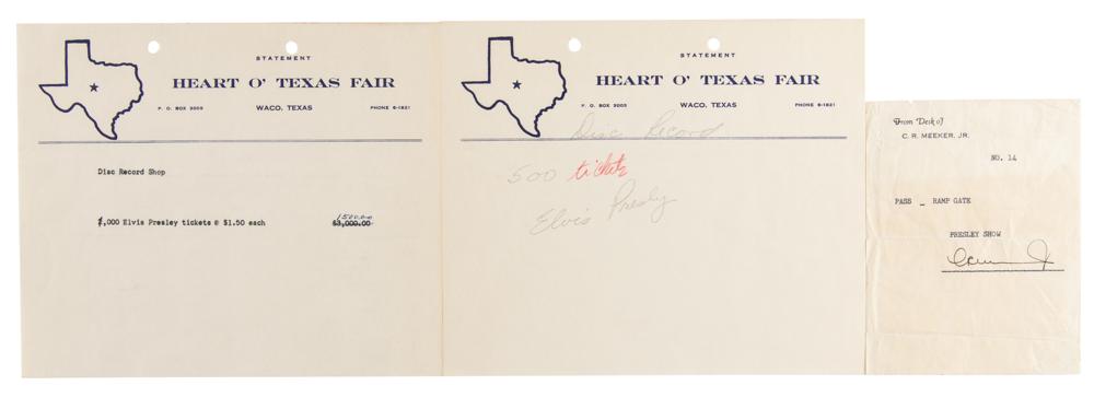 The five documents related to the Heart O’ Texas Fair relate to ticket prices for a “Disc Record Shop,” a ramp gate pass for a “Presley Show” signed by Dallas music director Charles R. Meeker, Jr., a list of VIPs admitted to the Fair’s backdoor, and a dressing room assignment list, with Room 6 marked for “Presley.” In overall fine condition.