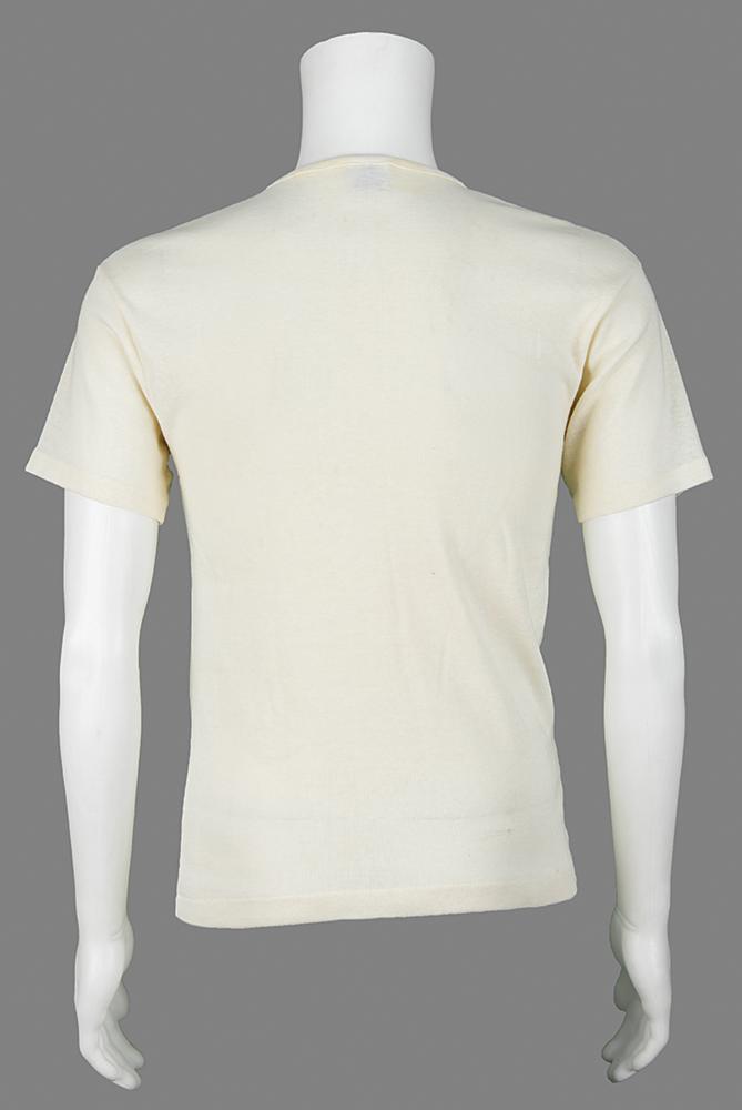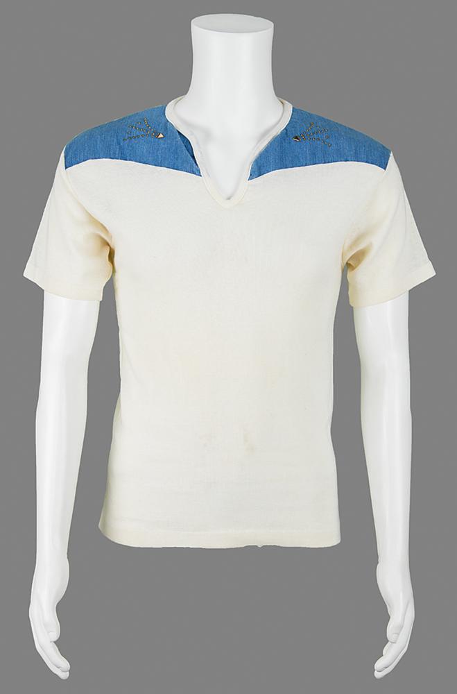 Vintage two-tone V-neck short-sleeved shirt personally-owned and -worn by Elvis Presley, who left this shirt at the home of friend and Dallas disc jockey Eddie Fadal when the former went to Army basic training in 1958. The shirt, size XL, 50% polyester 50% cotton, features a cream-colored body and sleeves, with blue shoulder sections that contain metal shooting star designs. In fine condition.