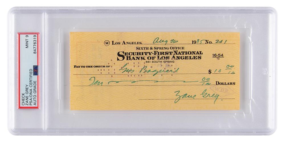 Bank check, 6 x 2.75, filled out and signed by Grey, "Zane Grey," payable to Gus Bagnard for $10, August 26, 1935. In fine condition. Encapsulated and graded by PSA/DNA as "MINT 9."
