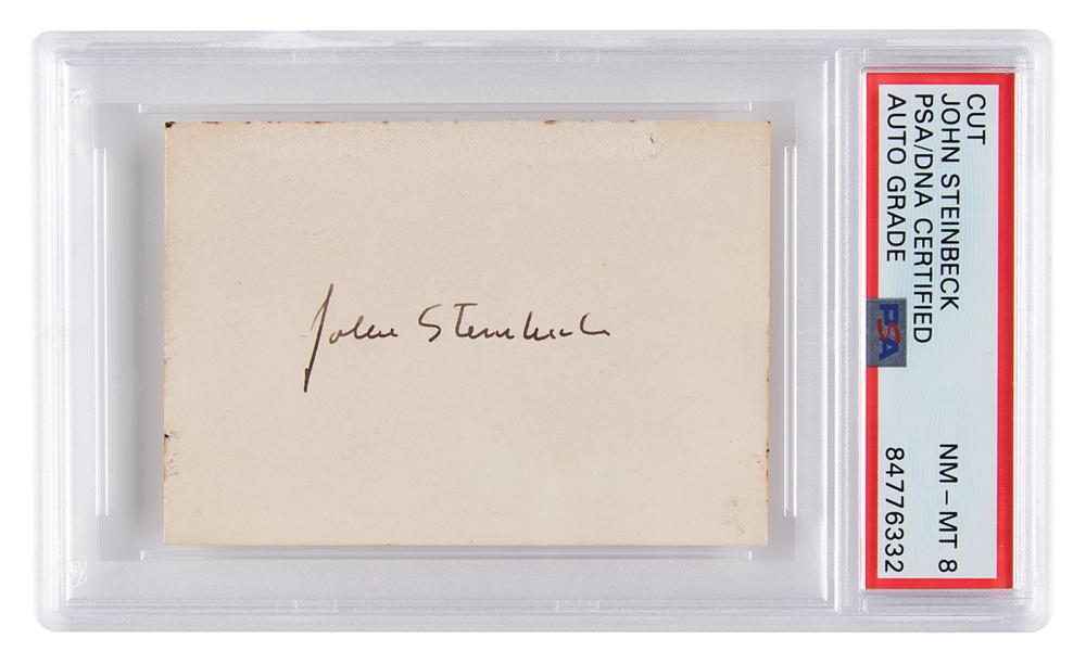 Vintage fountain pen signature, "John Steinbeck,” on an off-white 3 x 2.25 card. In fine condition, with minor surface loss along the top edge. Encapsulated and graded by PSA/DNA as "NM-MT 8."