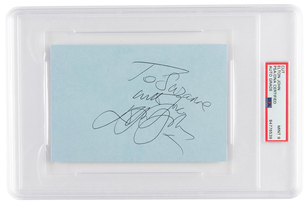 Ballpoint signature and inscription, "To Suzanne, with love, Elton John, x,” on a blue 6 x 4 card. In very fine condition. Encapsulated and graded by PSA/DNA as "MINT 9."