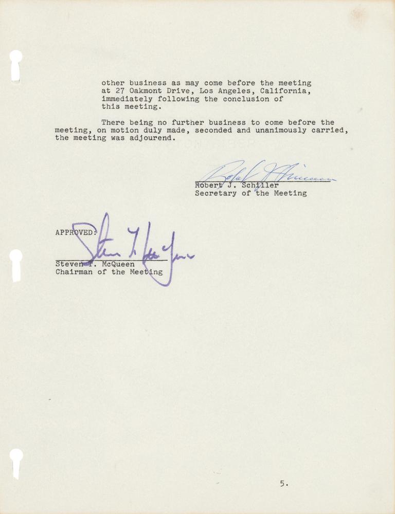 DS, signed “Steven T. McQueen,” one page, 8.5 x 11, November 14, 1967. Document headed "Minutes of Regular Meeting of the Shareholders of Solar Productions, Inc.," regarding the "production, financing and distribution of a motion picture now entitled 'The Crown Caper,'" and the purchase of the "motion picture rights in and to the novel entitled 'the Cold War Swap.'" It goes on to make reference to "Suddenly Single," "Le Mans," "Bullitt," and "Man on a Nylon String." In very fine condition.
