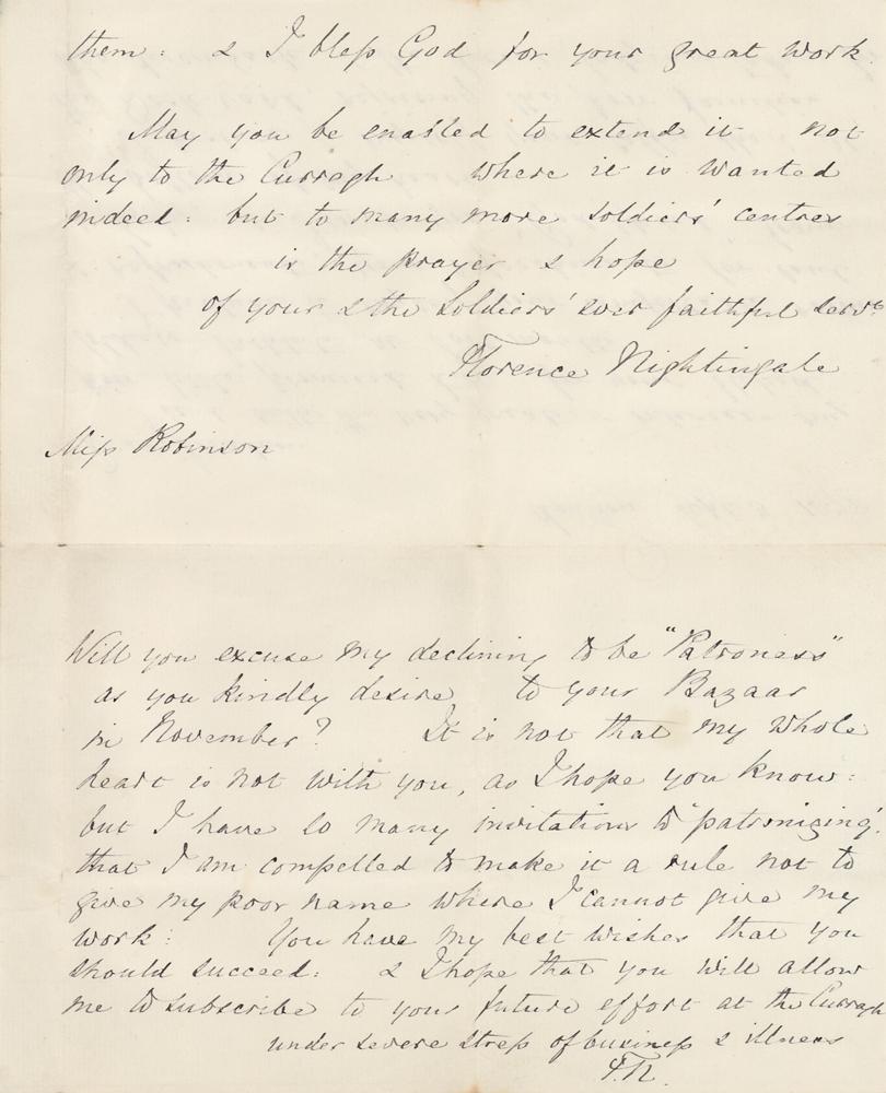 ALS signed “Your and the soldiers’ ever faithful servant, Florence Nightingale,” one page both sides, 8 x 10, September 3, 1878. Handwritten letter in support of a charitable cause, in part: "I send with the very greatest interest my poor little promised £10 for your blessed Soldier's Institute at Portsmouth. I picture to myself your comfortable rooms & refreshments for soul & body, & I wish you 'God speed' from the bottom of my heart. I picture to myself your coffee-shed at the Dock-yard, rejoicing the poor families who disembark, & the decent lodgings taken for them, & I bless God for your great work." She adds a lengthy postscript requesting anonymity, initialed "F.L.," in part: "Will you excuse my declining to be 'Patroness' as you kindly desire, to your Bazaar in November? It is not that my whole heart is not with you, as I hope you know but I have so many invitations to 'patronizing' that I am compelled to make it a rule not to give me poor name where I cannot give my work." In fine condition, with some light creasing.