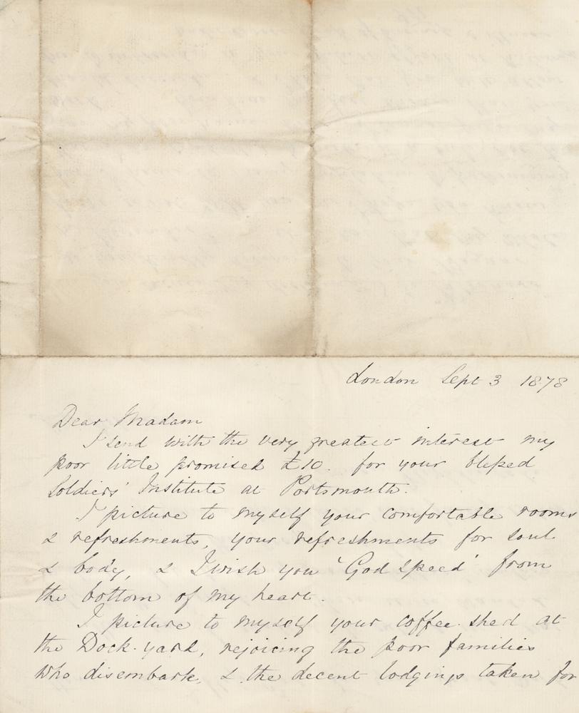 Florence Nightingale donates to the "Soldier's Institute at Portsmouth," in support of "comfortable rooms & refreshments for soul & body"