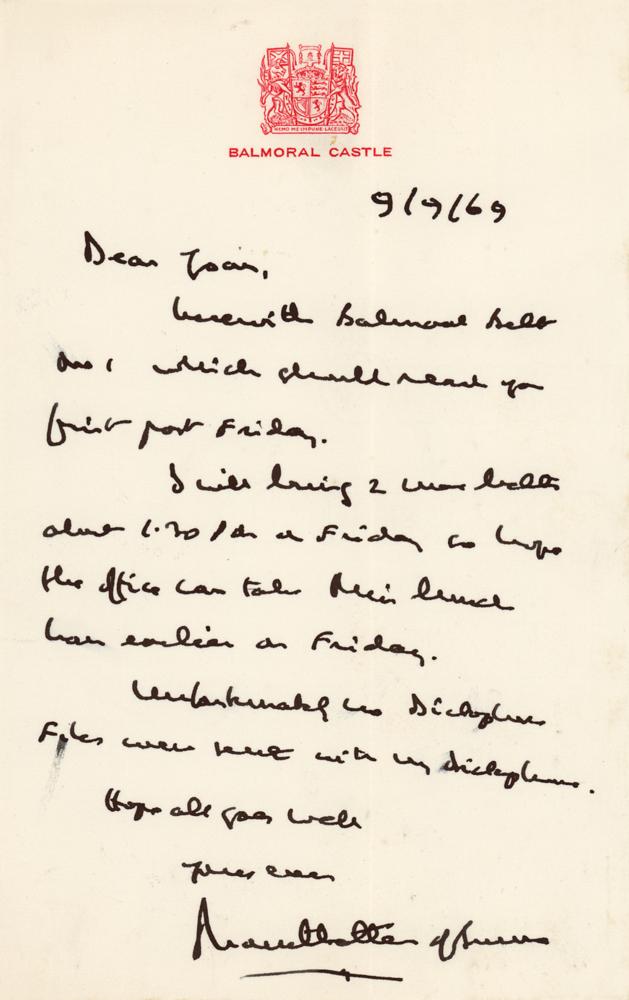 ALS signed “Mountbatten of Burma,” one page, 4.75 x 7.5, Balmoral Castle letterhead, September 9, 1969. Handwritten letter to "Joan," making arrangements for an upcoming lunch. In fine condition.