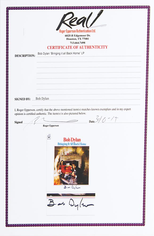 Spectacular vinyl copy of Bob Dylan’s fifth studio album, Bringing It All Back Home, signed nicely on the front cover in black felt tip. In very fine condition. The record is included. Accompanied by a full letter of authenticity from REAL and by a letter of provenance from Dylan's manager, Jeff Rosen, who states: “I represent Bob Dylan and have done so for many years. In 2017 he signed a number of individual albums on a rare and limited basis?The chain of custody is directly from Bob Dylan to myself.”