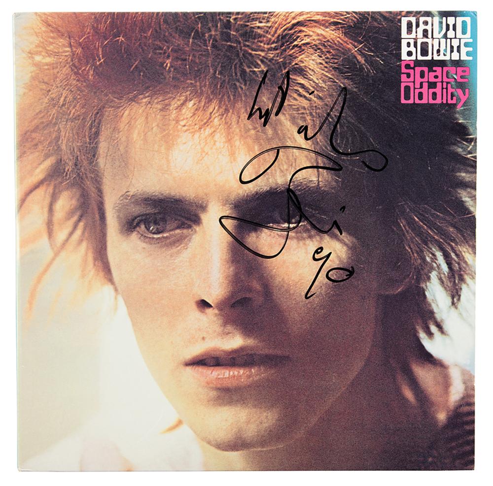 Space Oddity album signed on the cover in black felt tip, "Best wishes, Bowie, 90." In fine to very fine condition. The records are included.