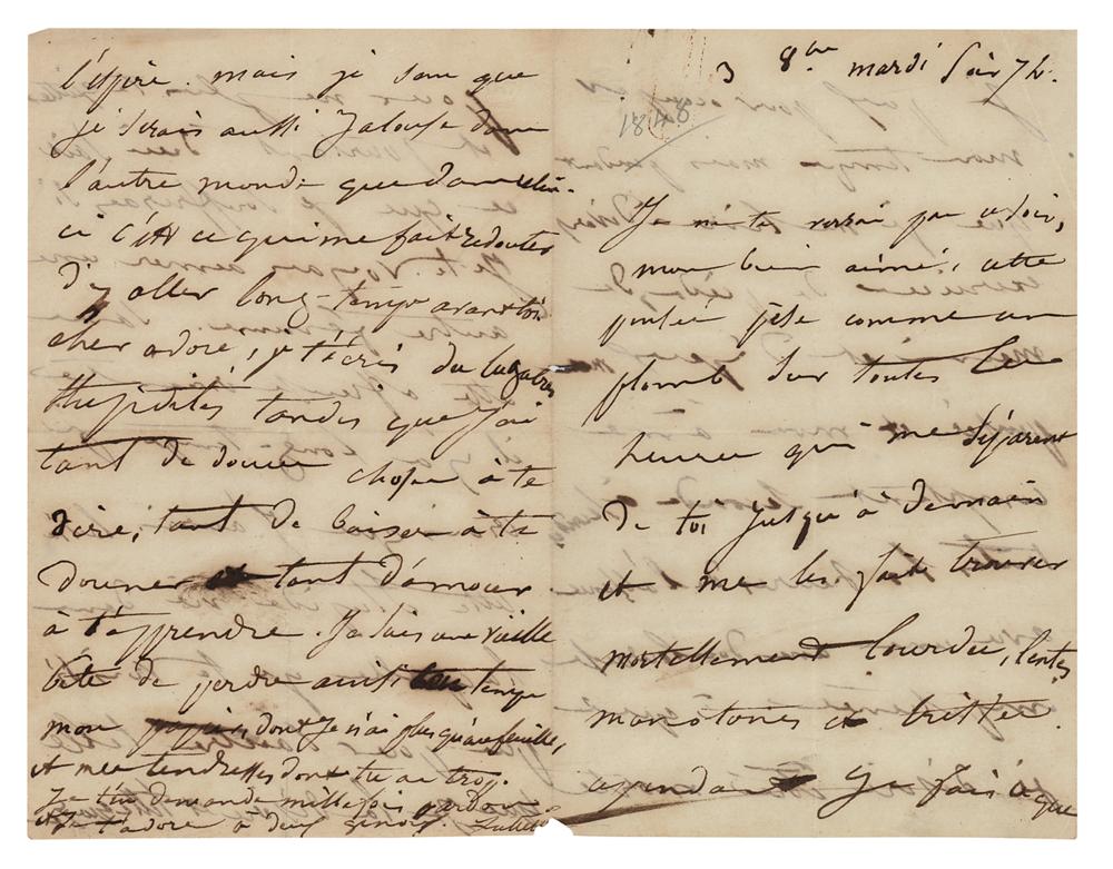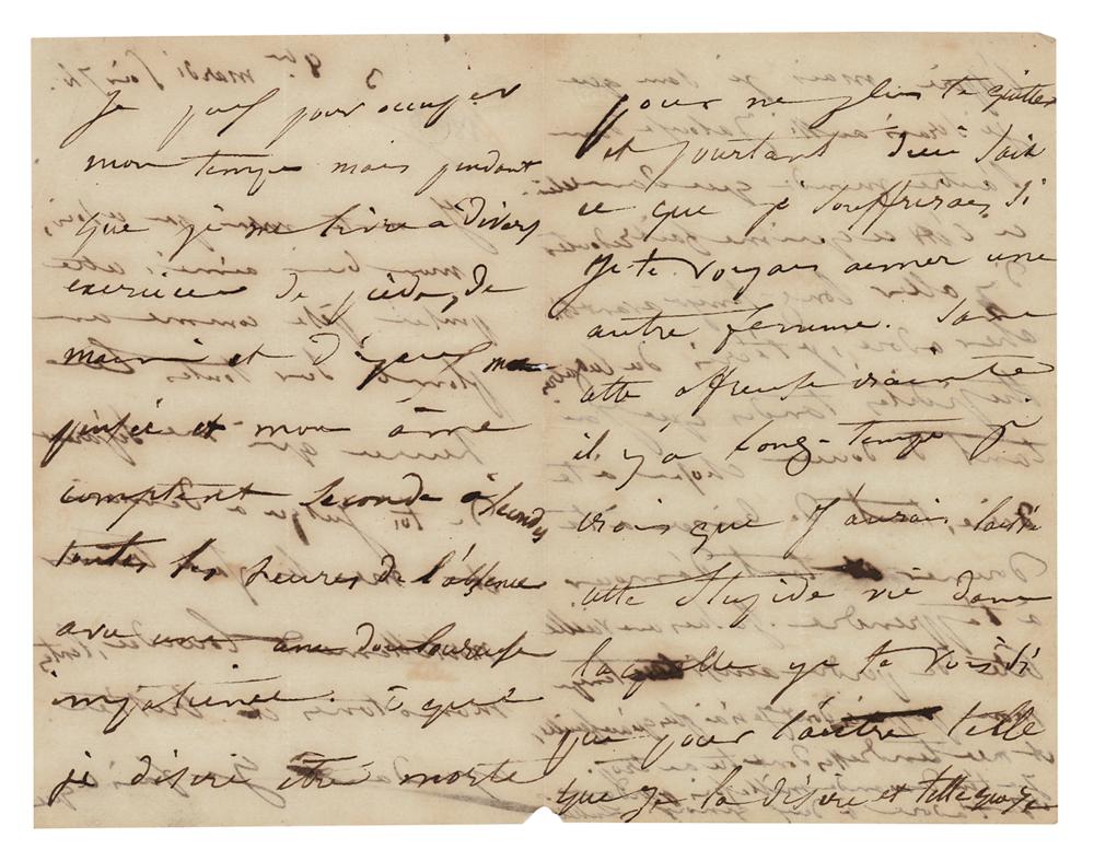 French actress (1806-1883) who abandoned her career after becoming the mistress of Victor Hugo, to whom she acted as a secretary and traveling companion. ALS in French, signed “Juliette,” four pages on two adjoining sheets, 4.75 x 7.5, October 3, 1848. Handwritten letter to illustrious French writer Victor Hugo by his lifetime lover, allowing one to glimpse their daily life and bearing witness to Juliette Drouet’s amorous devotion. In part (translated): "I shall not see you tonight, my beloved. This thought weights as heavily as a piece of lead upon all the hours before tomorrow, and makes me find them fatally heavy, slow, monotonous and gloomy. However, I am doing what I can to make time pass, but while I make various exercises with my feet, hands and eyes, my thoughts and my soul are counting second after second every hour of absence with a painful impatience. O, how much I would like to be dead, so as not to leave you again. God knows how much I would suffer, should I see you love another woman. Were it not for this terrible fear, I would have long ago relinquished this stupid life in which I see you so rarely, and exchanged it for the other one as I would like it to be, and as I hope it will be. But I know that I would be as jealous in the other world as in this one, and this is what makes me go there long before you. Dear beloved, I am writing you gloomy nonsense, while I have so many sweet things to tell you, so many kisses to give you and so much love to teach you. I am stupid to waste away your time, my paper of which only one page is left, and my tenderness, of which you have too much. I beg your pardon one thousand times for this, and I adore you, knelt on my two knees before you." In fine condition, with a tiny loss to the corner tip, affecting the last letter of her signature.