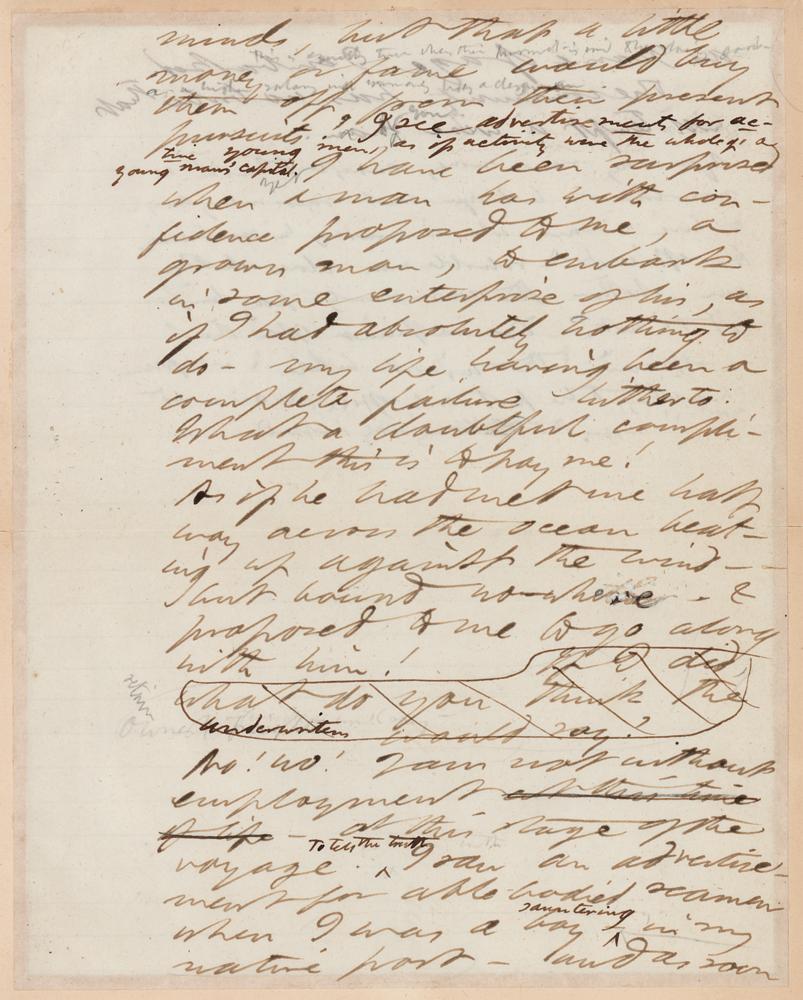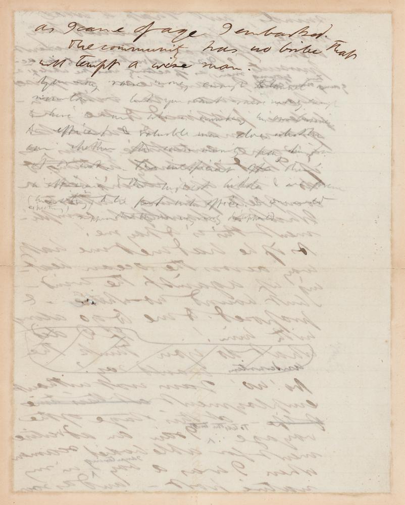 Fantastic handwritten manuscript by Henry David Thoreau containing a segment of his important essay ‘Life Without Principle,’ one page both sides, 7.5 x 9.5, originally published in 'The Atlantic Monthly' in 1863 and in which Thoreau offers his program for a righteous livelihood. Thoreau writes, in part: "I see advertisements for active young men, as if activity were the whole of a young man’s capital. Yet I have been surprised when a man has with confidence proposed to me, a grown man, to embark on ‘some enterprise’ of his, as if I had absolutely nothing to do my life having been a complete failure hitherto. What a doubtful compliment this is to pay me! As if he had met me half way across the ocean beating up against the wind—but bound nowhere—& proposed to me to go along with him! If I did, what do you think the underwriters would say? No! no! I am not without employment at this time of life at this stage of the voyage. To tell the truth I saw an advertisement for able-bodied seamen when I was a boy sauntering in my native port—and as soon as I came of age I embarked. The community has not bribe that will tempt a wise man." Professionally inlaid into a slightly larger sheet, as issued in the first volume of the 1906 ‘manuscript edition’ of Thoreau’s works, published by Houghton Mifflin. In fine condition.