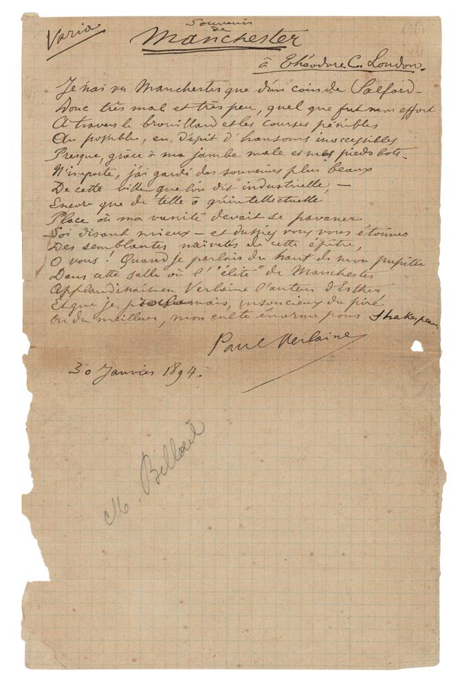 Famed and highly influential French poet (1844-1896) who penned Poèmes saturniens and Romances sans paroles; likewise remembered for his tumultuous love affair with the prodigiously gifted teenage poet Arthur Rimbaud. Autograph poem in French, signed "Paul Verlaine," one page, 5.25 x 8.25, January 30, 1894. Verlaine pens a "Memory of Manchester," celebrating the time he spent in the English city. Verlaine makes note of his “enormous worship” for Shakespeare, whom he extolled during conferences in front of the local intellectual elite, a fact recalled in this poem. In very good to fine condition, with a small hole, a rough left edge, and light toning along the central horizontal fold.