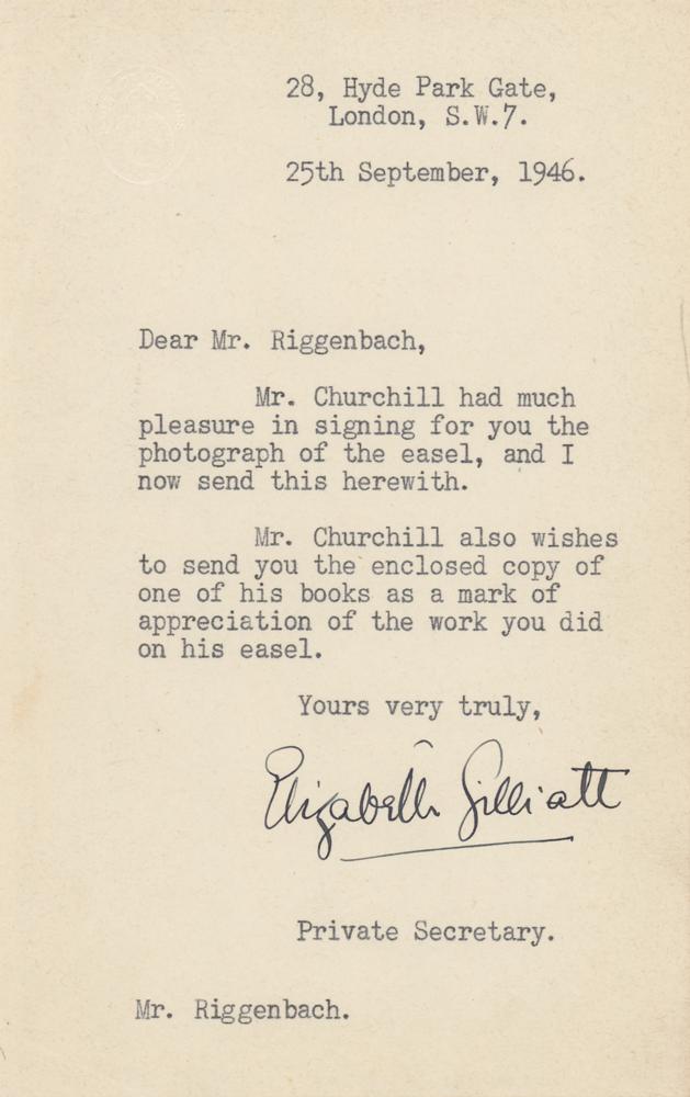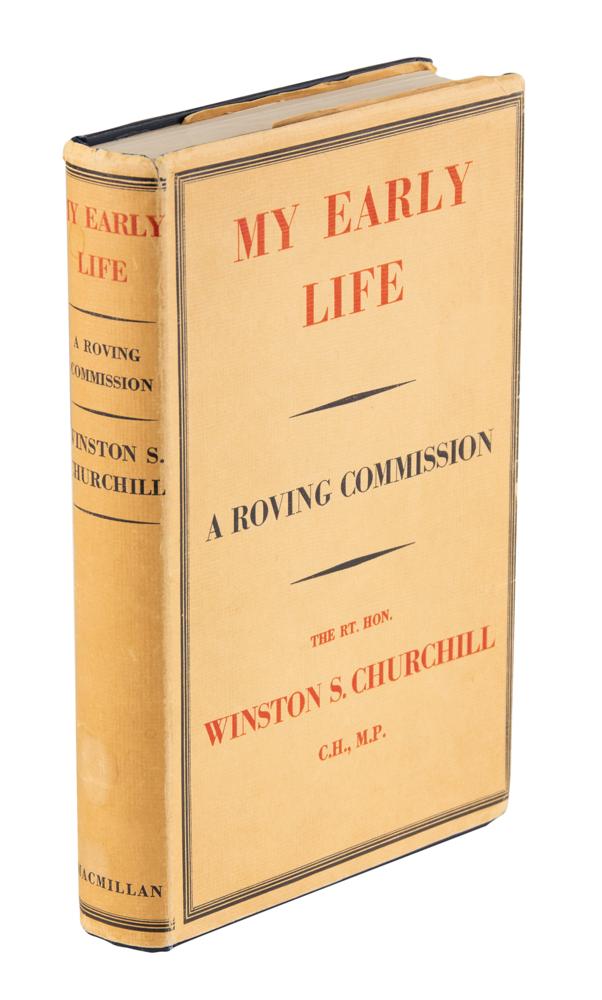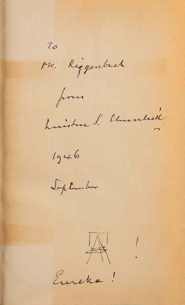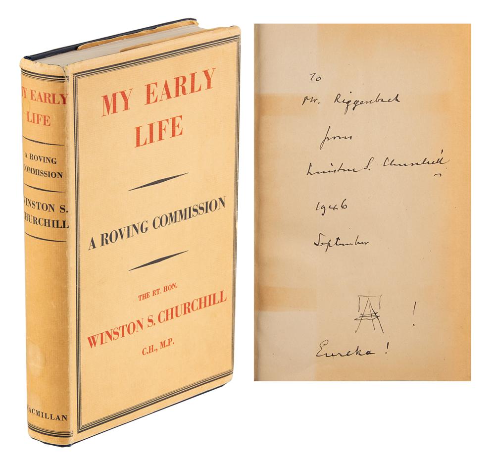 Signed book: My Early Life: A Roving Commission. Later printing. London: Macmillan & Co. Ltd., 1942. Hardcover with dust jacket, 5.75 x 8.75, 392 pages. Signed and inscribed on the first free end page in fountain pen, "To Mr. Riggenbach, from Winston S. Churchill, 1946, September." Below, he adds a sketch of an easel, writing "Eureka!" Autographic condition: very good to fine, with irregular light toning to the signed page. Book condition: VG/VG, with a clipped portrait of Churchill affixed to the front pastedown, some light stains to spine, and minor nicks at spine head (reinforced inside with old, toned tape). Accompanied by a transmittal letter from his private secretary, Elizabeth Gilliatt, in part: "Mr. Churchill?wishes to send you the enclosed copy of one of his books as a mark of appreciation of the work you did on his easel." It seems that Mr. Riggenbach must have built a new easel for Churchill, who held painting as one of his dearest pastimes. A unique and desirable association copy of Churchill's autobiographical account of his early life.