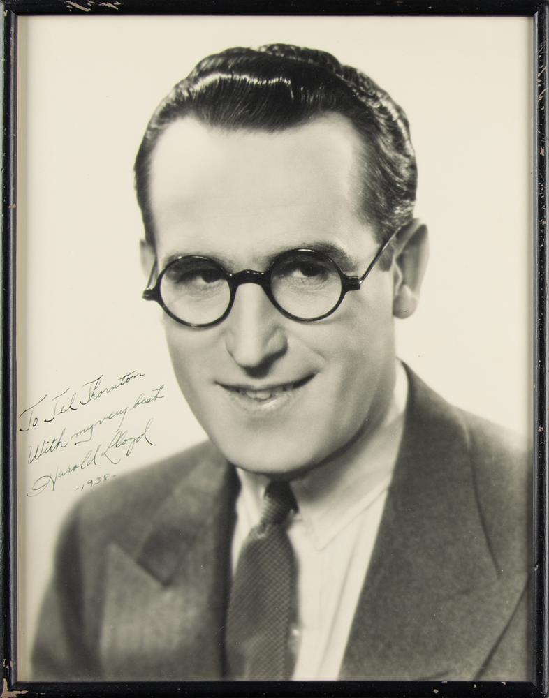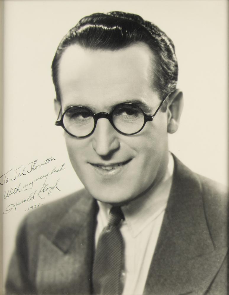 Impressive vintage matte-finish 10 x 13 portrait photo of the famed bespectacled comedian, signed and inscribed in fountain pen, "To Ted Thornton, with my very best, Harold Lloyd, -1938-.” Framed and in fine condition. An appreciably scarce oversized photograph of Lloyd, already an elusive star of the silent film era.