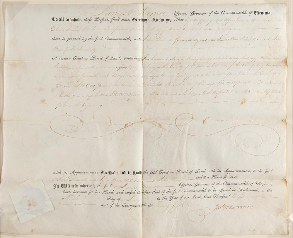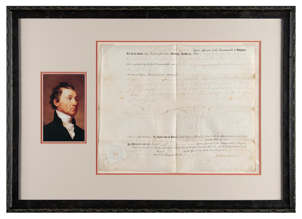 Partly-printed vellum DS, signed “Jas. Monroe,” one page, 14.5 x 12, July 9, 1800. As governor of Virginia, Monroe grants "a certain Tract or Parcel of Land, containing Two hundred Acres by Survey?in the County of Russell." Neatly signed at the conclusion in ink by Governor Monroe. Handsomely corner-mounted, double-matted, and framed with a portrait to an overall size of 27 x 19.5. In fine condition.