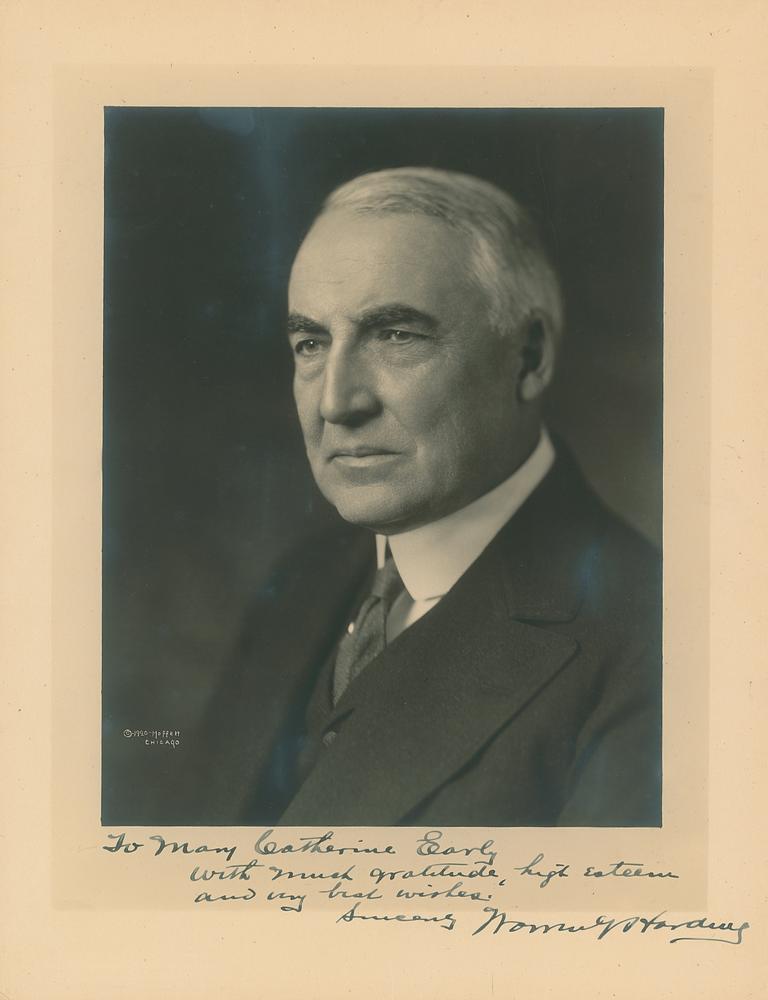 Sharp matte-finish 9.75 x 12.5 photo of Harding by Moffett of Chicago, boldly signed and inscribed in the lower border in fountain pen, "To Mary Catherine Early, with much gratitude, high esteem, and my best wishes, Sincerely Warren G. Harding.” In fine condition, with areas of light silvering.
