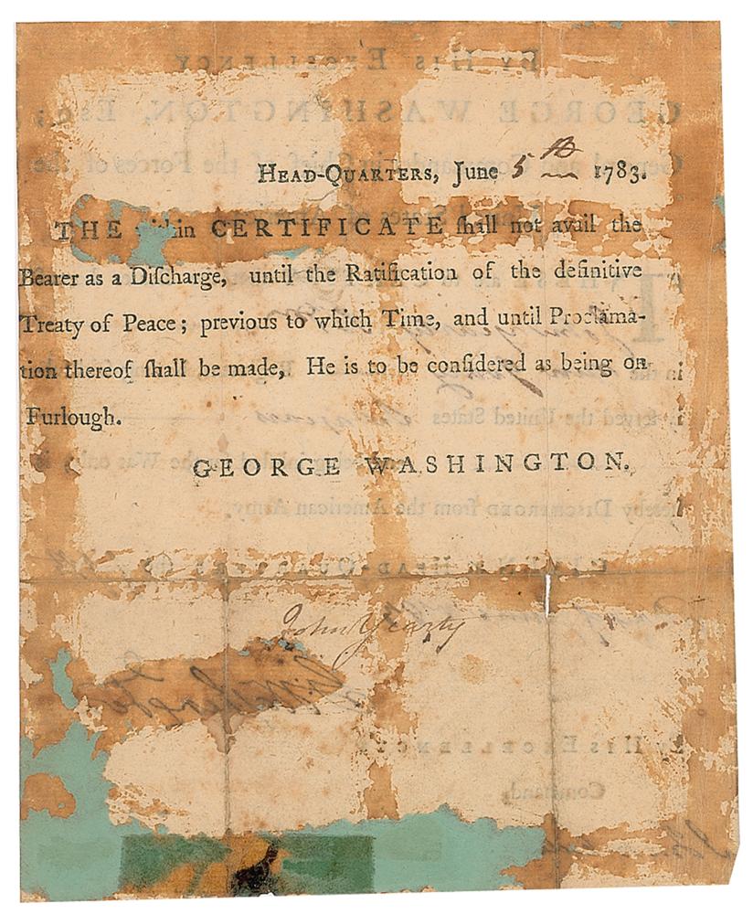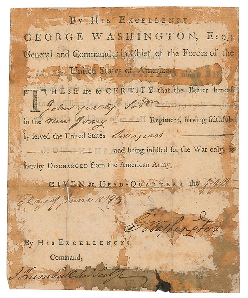 Important Revolutionary War-era partly-printed DS, signed “Go: Washington,” one page, 6.25 x 7.75, June 5, 1783. Continental Army military discharge headed “By His Excellency George Washington, Esq., General and Commander in Chief of the Forces of the United States of America.” In part: “These are to certify that the Bearer hereof John Yearty Sol'dr in the New Jersey Regiment, having faithfully served the United States six years and being inlisted for the War only, is hereby Discharged from the American Army.” Boldly signed at the conclusion by General Washington, and countersigned below by Jonathan Trumbull, Jr. On the reverse is a statement noting that the certificate "shall not avail the Bearer as a Discharge, until the Ratification of the definitive Treaty of Peace," and that he is to be considered on furlough until that time. In good condition, with trimmed edges, some mounting remnants on the reverse, and heavy staining affecting appearance. As commander-in-chief of the Continental Army during the American Revolution, General Washington took it upon himself to organize and train his soldiers. By war's end, this highly disciplined and hands-on approach carried over into Washington insisting on signing every discharge certificate personally. Dating to the end of the Revolutionary War and featuring a bold signature of the nation's first commander-in-chief, this is an immensely desirable discharge for one of America’s veteran patriots.