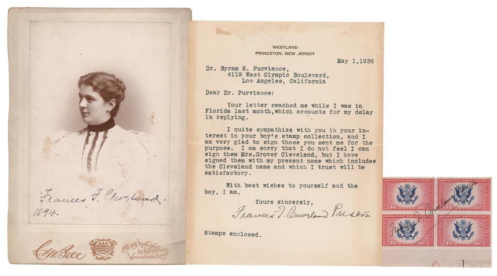 Interesting collection of three items signed by First Lady Frances Cleveland: a 5 x 7 mounted photograph by C. M. Bell, signed in ink, "Frances F. Cleveland, 1894"; a 16-cent 'Special Delivery' stamp block, signed in ink, "Frances F. Cleveland Preston"; and a TLS signed "Frances F. Cleveland Preston," one page, 5.25 x 6.75, Westland letterhead, May 1, 1936, in part: "I quite sympathize with you in your interest in your boy's stamp collection, and I am very glad to sign those you sent me for the purpose. I am sorry that I do not feel I can sign them Mrs. Grover Cleveland, but I have signed them with my present name which includes the Cleveland name." In very good to fine condition, with edge toning to the letter, and soiling and scuffing to the trimmed photo.