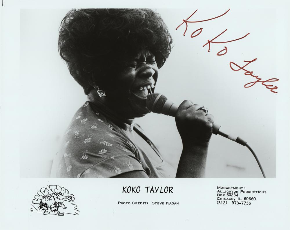 Glossy 10 x 8 Alligator Records promo photo of Koko Taylor belting out a classic blues number, neatly signed in brown felt tip. In fine condition.