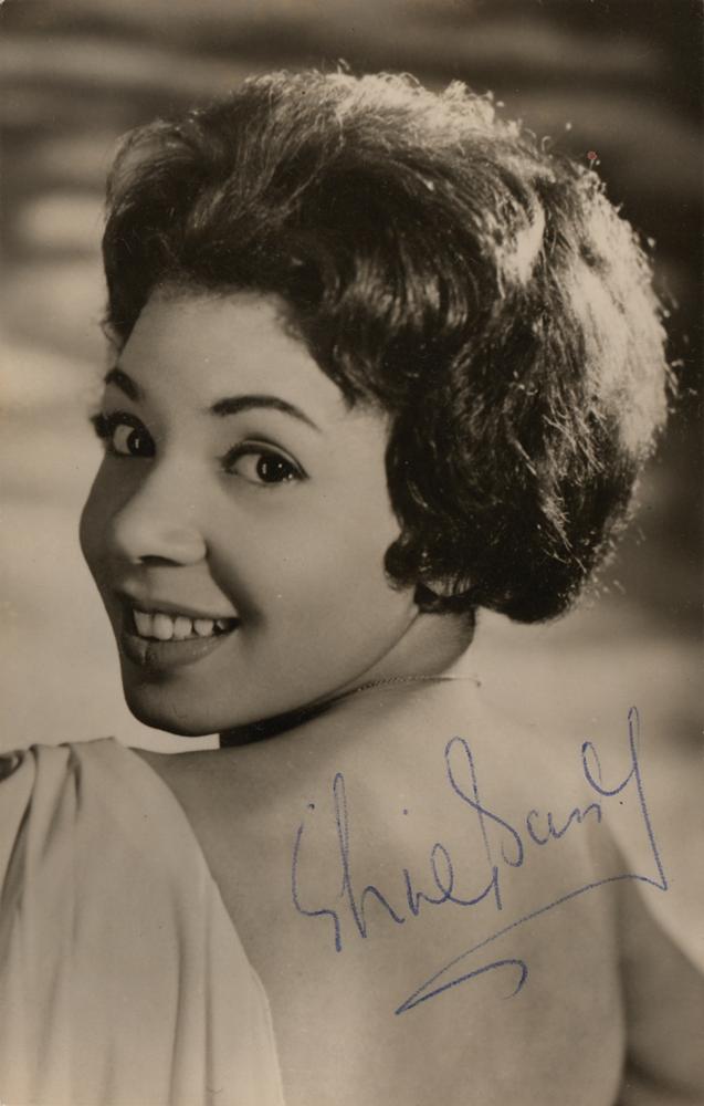 Vintage matte-finish 3.5 x 5.5 photo of the powerful vocalist glancing over her shoulder, signed in blue ballpoint, "Shirley Bassey." In fine condition, with a faint horizontal bend.