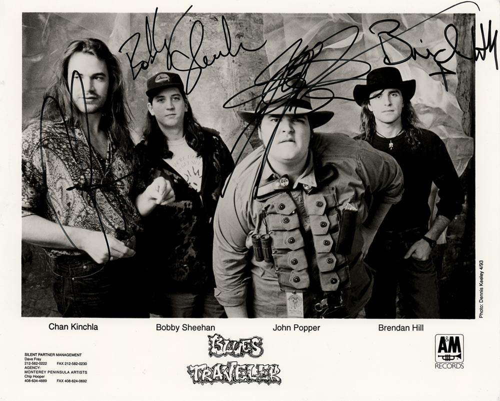 Glossy 10 x 8 A&M records publicity photo of Blues Traveler, signed in black felt tip by John Popper, Chan Kinchla, Brendan Hill, and Bobby Sheehan. In fine condition.