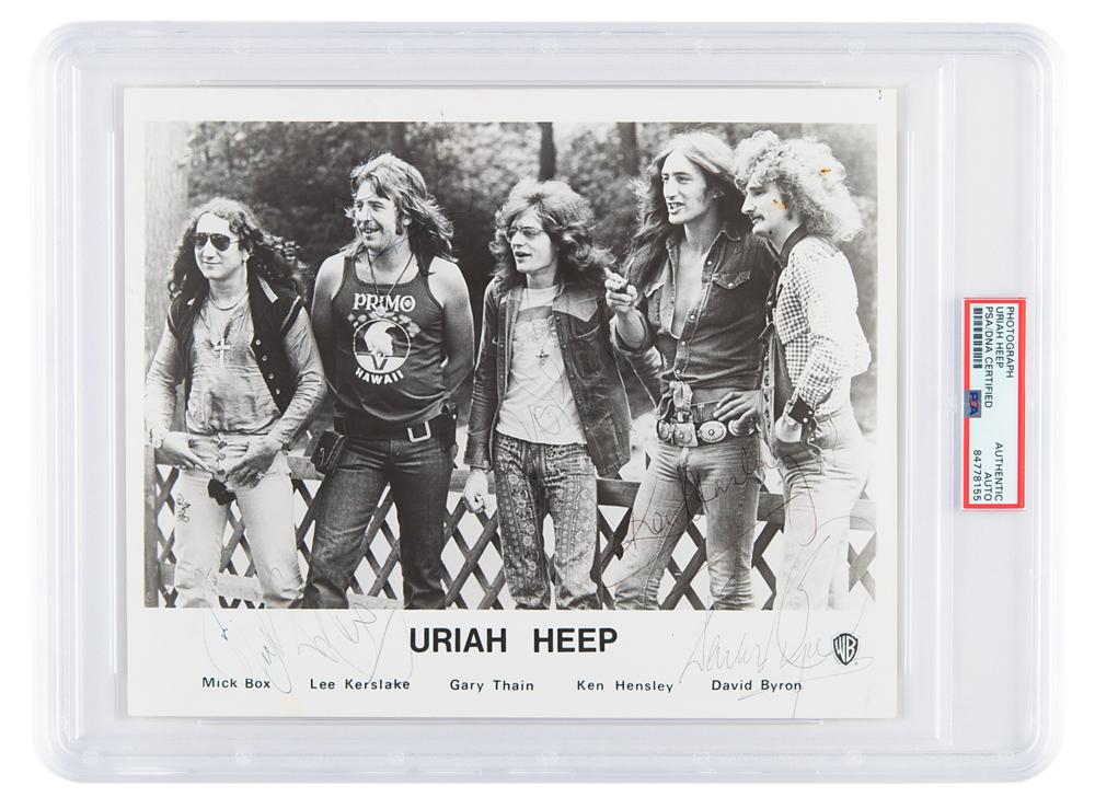 Desirable vintage glossy 10 x 8 Warner Brothers publicity photo of Uriah Heep, signed in ballpoint by Mick Box, Lee Kerslake, Gary Thain, Ken Hensley, and David Byron. In very good to fine condition, with scattered light creasing. Encapsulated in a PSA/DNA authentication holder.