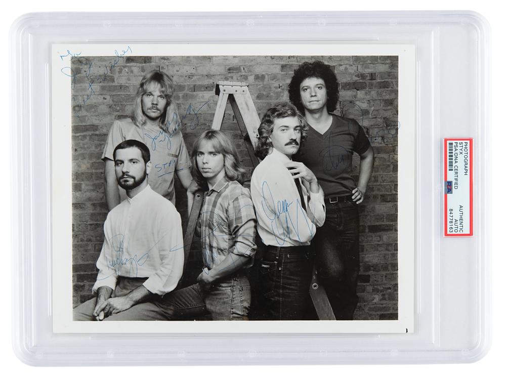 Excellent early glossy 10 x 8 photo of Styx posing with a ladder in front of a brick wall, signed in ballpoint by the band’s original lineup of Dennis DeYoung, James Young, who adds the inscription, “To J. J., best wishes,” John Curulewski, Chuck Panozzo, and John Panozzo. In fine condition. Encapsulated in a PSA/DNA authentication holder.