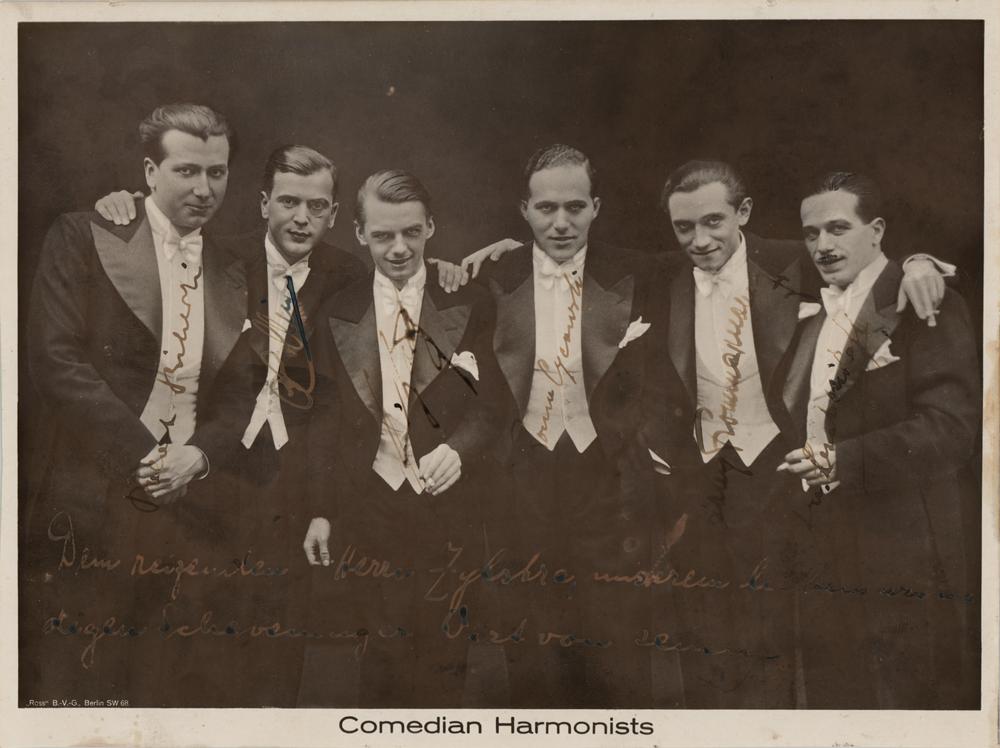 Vintage matte-finish 9.25 x 7 photo of the Comedian Harmonists, an internationally famous, all-male German harmony ensemble, signed in fountain pen by Robert Biberti, Erich Collin, Erwin Bootz, Roman Cycowski, Harry Frommermann, and Asparuh 'Ari' Leschnikov. An inscription is penned below in an unknown hand. In very good to fine condition.