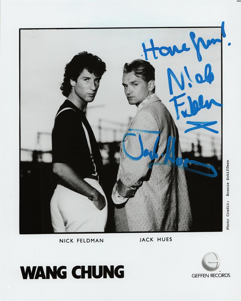 Glossy 8 x 10 Geffen Records promo photo of Wang Chung, signed in blue paint pen, "Have fun! Nick Feldman" and "Jack Hues." In fine condition.
