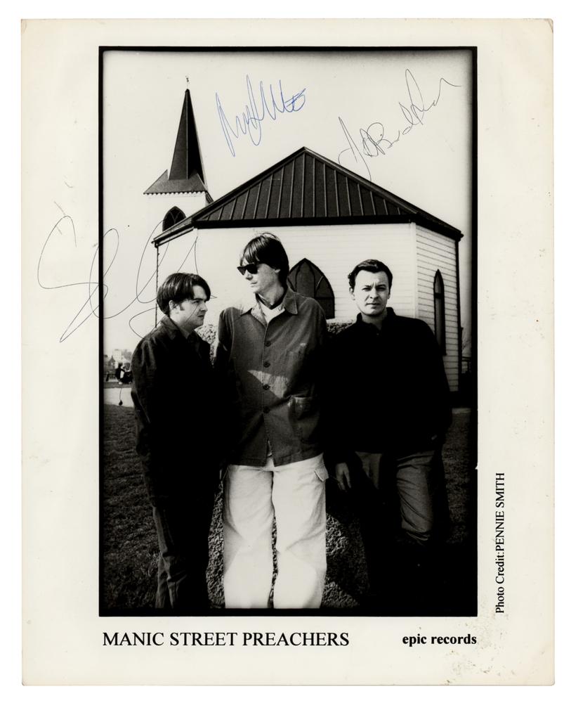 Glossy 8 x 10 Epic Records publicity photo of the Manic Street Preachers, signed in ballpoint by James Dean Bradfield, Sean Moore, and Nicky Wire. In very good condition, with overall creasing.