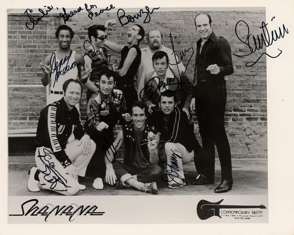 Glossy 10 x 8 publicity photo of Sha Na Na posing together against a brick wall, signed in black felt tip by Johnny Contardo, Dave ‘Chico’ Ryan, Screamin' Scott Simon, Danny McBride, Frederick ‘Denny’ Greene, Donny York, Lennie Baker, Jocko Marcellino, Scott ‘Tony Santini’ Powell, and Jon ‘Bowzer’ Bauman, who adds the inscription, “To Charlie, Grease for Peace.” In fine condition.
