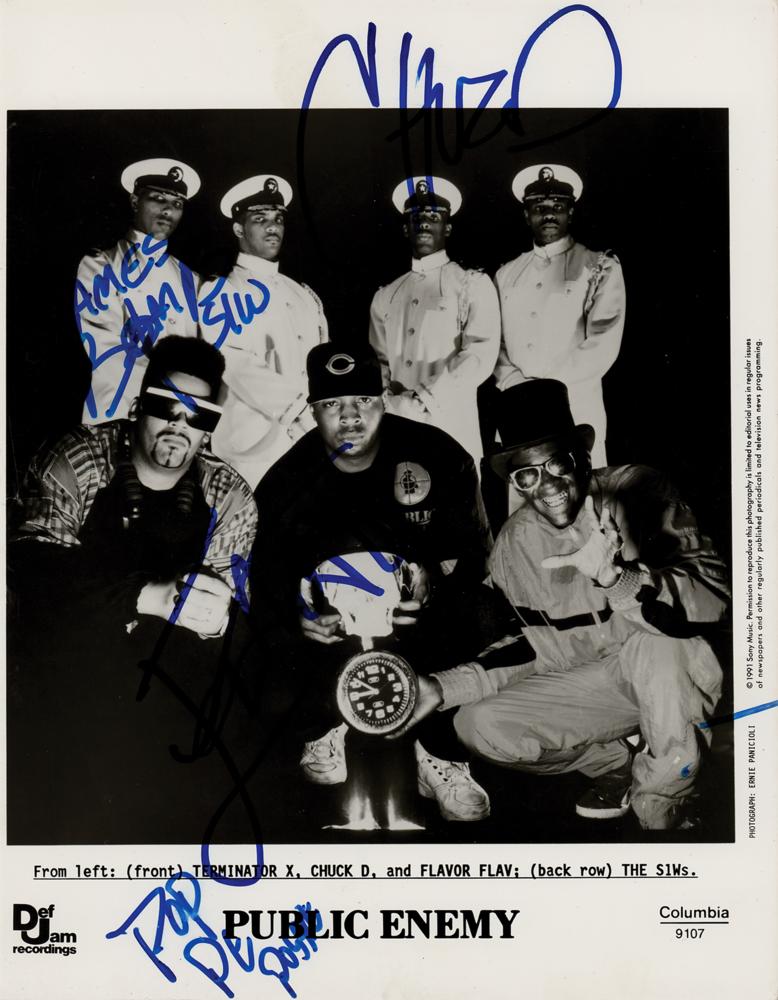 Glossy 8 x 10 Def Jam / Columbia publicity photo of Public Enemy, a pose similar to the cover of their 1991 album Apocalypse 91? The Enemy Strikes Black, signed in blue felt tip by Chuck D, Flavor Flav, and James Bomb. In fine condition.