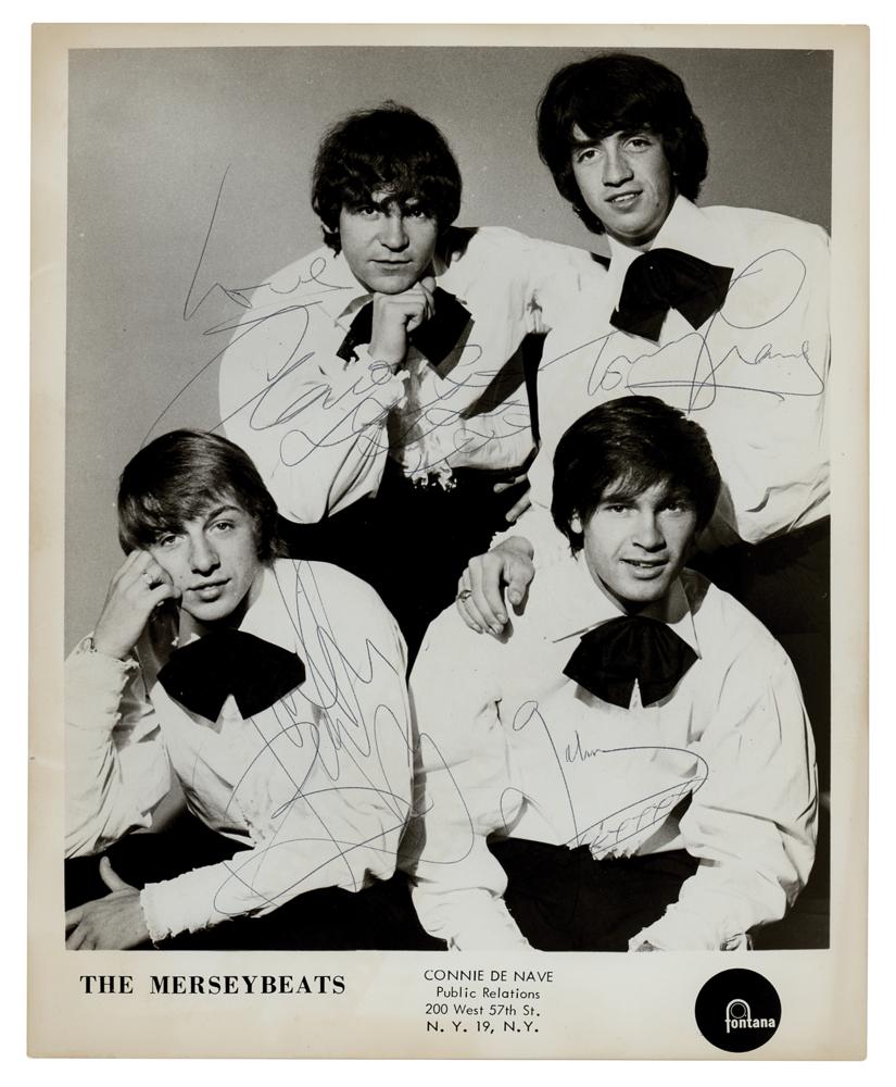Glossy 8 x 10 Fontana Records publicity photo of The Merseybeats in matching outfits, signed in black ballpoint by Aaron Williams, Tony Crane, John Banks, and Johnny Gustafson. In fine condition.