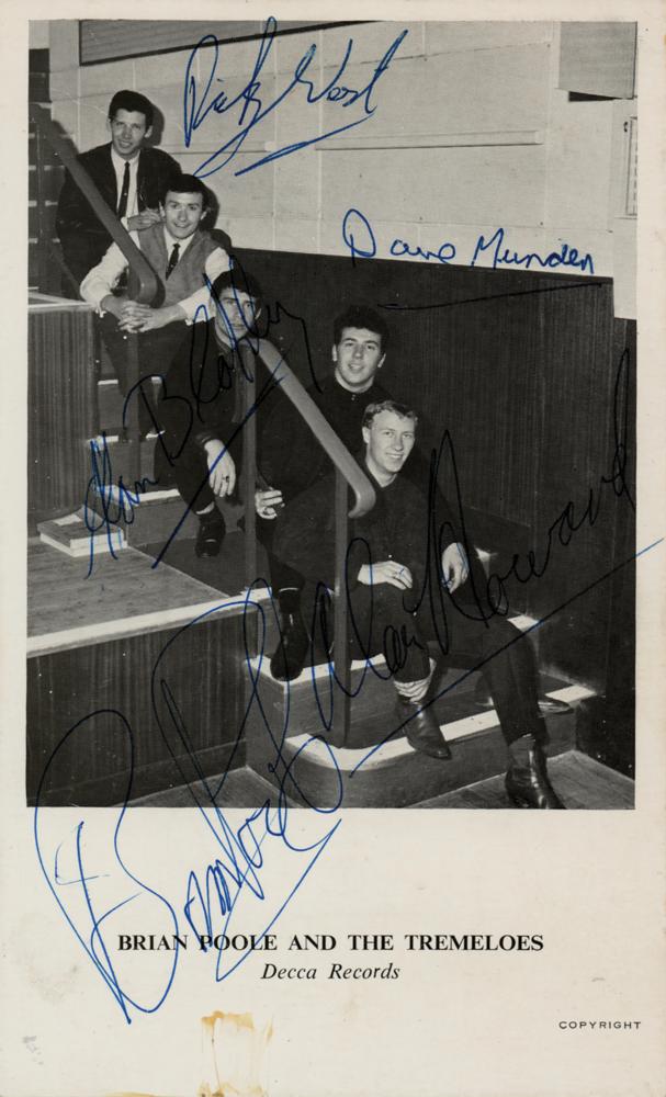Glossy 3.5 x 6 Decca Records promotional photo card for Brian Poole and the Tremeloes, signed in blue ballpoint by Poole, Rick Westwood, Dave Munden, Alan Blakley, and Alan Howard. In fine condition.
