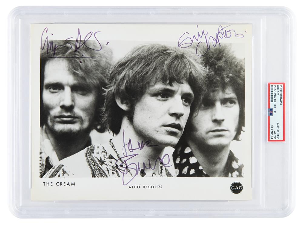 Superb vintage glossy 10 x 8 GAC and Atco Records publicity photo of ‘The Cream,’ showing the rock trio in a close-up band pose, signed in black felt tip by Eric Clapton, Jack Bruce, and Ginger Baker. In fine condition. Encapsulated in a PSA/DNA authentication holder. A fantastic fully signed offering with large vintage autographs.
