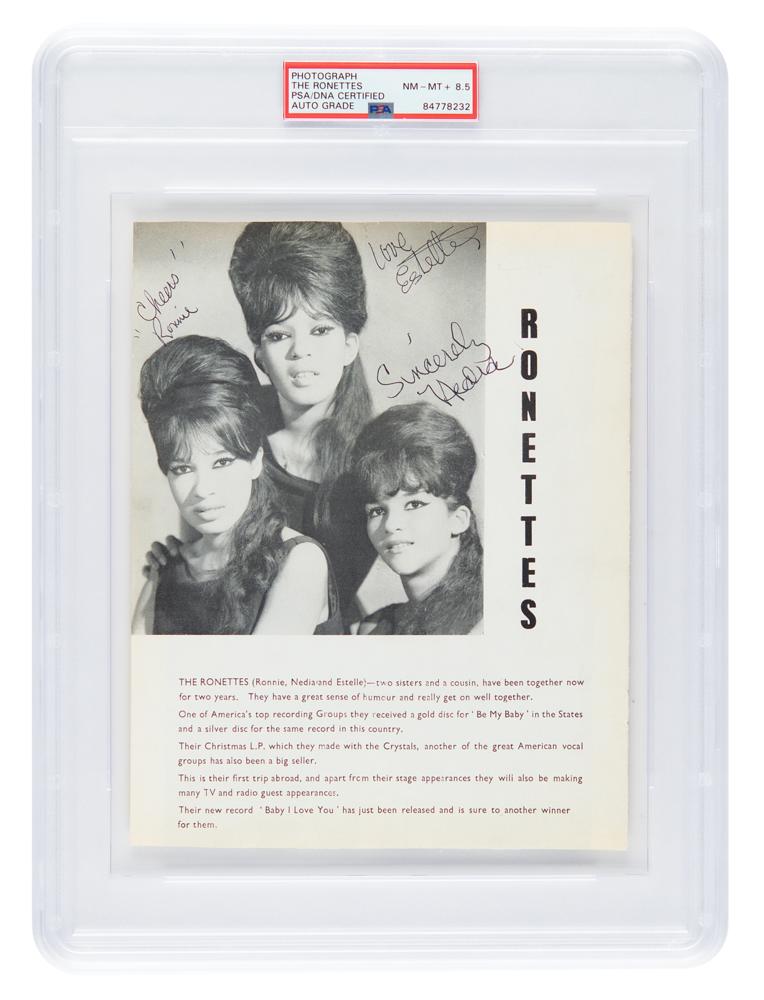 Vintage 7 x 8.75 concert program page for the Ronettes, featuring a group photo and biography, signed in black ballpoint, “‘Cheers’ Ronnie,” “Love, Estelle,” and “Sincerely, Nedia.” In fine condition, with a bit of mild edge toning and mounting remnants to reverse. Encapsulated and graded by PSA/DNA as "NM-MT+ 8.5."